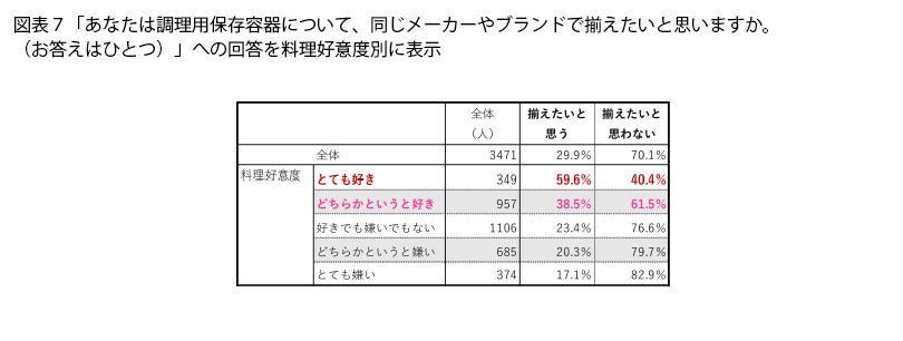 また、保存容器を同じメーカーやブランドで揃えたいかどうかを聞くと(図表7)、「揃えたい」と回答したのは全体では29.9%ですが、「とても好き」の人は59.6%と半数を超えています。「どちらかというと好き」の人でも38.5%ですから、大きな差があります。
