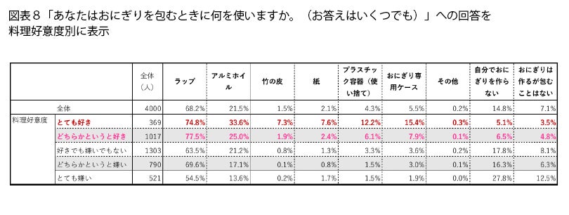 おにぎりを包むときに何を使うかという質問に対しては(図表8)、全体では「ラップ」と回答した人が68.2%とかなり高く、定番と言えそうです。料理が好きな人は、おにぎりを包むときにもいろいろなバリエーションを楽しんでいるようで、「おにぎり専用ケース」(全体:5.5%、「とても好き」:15.4%)や「竹の皮」(全体1.5%、「とても好き」:7.3%)で差がありました。