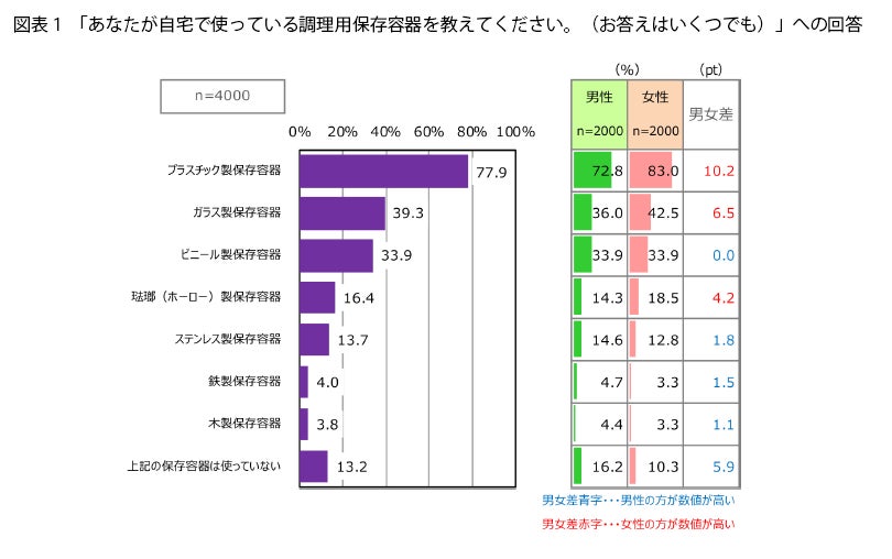 まず、自宅で使っている調理用保存容器の種類を聞いたところ(図表1)、「プラスチック製保存容器」が77.9%でトップでした。