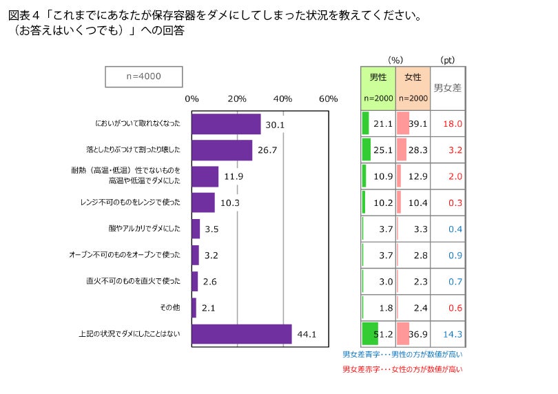 保存容器をダメにしてしまった状況について聞くと(図表4)、最も割合が高かったのは「においがついて取れなくなった」(30.1%)、次いで「落としたりぶつけて割ったり壊した」(26.7%)でした。
