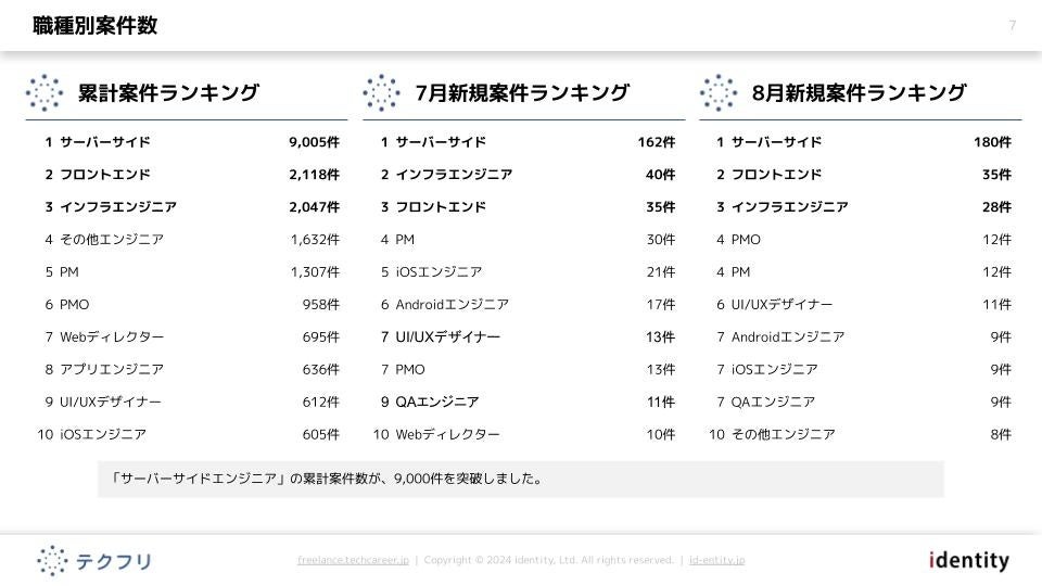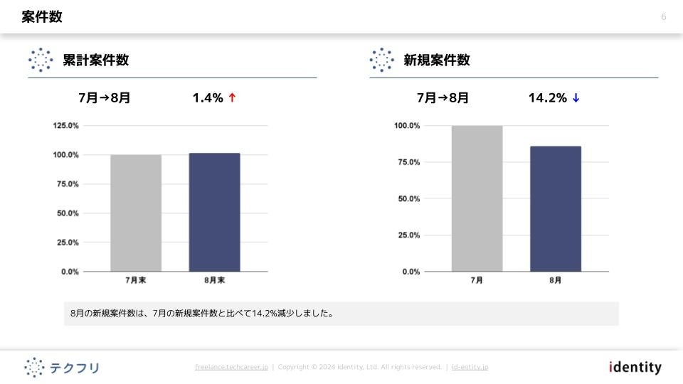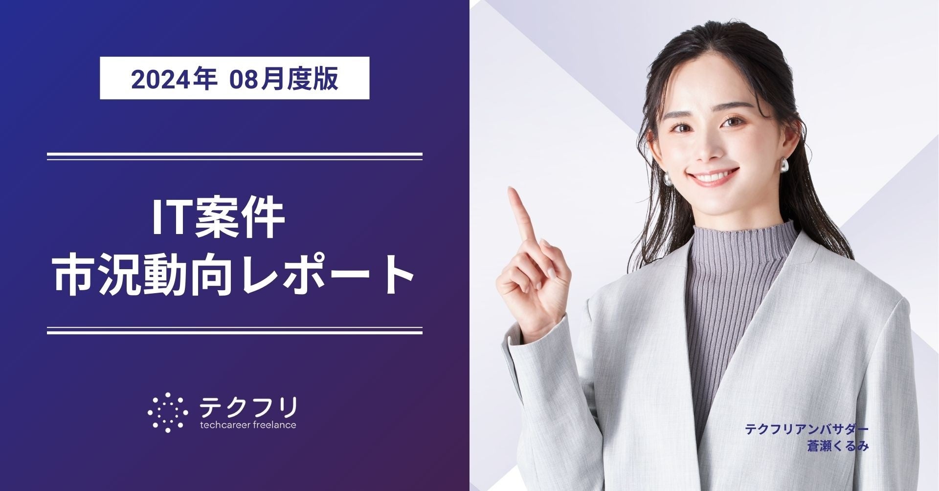 ITフリーランスエンジニアの案件・求人サイト「テクフリ」(https://freelance.techcareer.jp/)を運営する株式会社アイデンティティー(東京都新宿区、代表取締役:今野 力、以下「当社」)は、テクフリのデータベースをもとに2024年8月における案件の市況感を調査しました。より詳しい結果については、お問い合わせから資料請求が可能です。