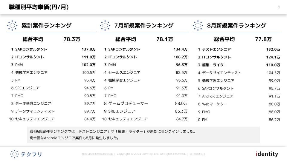 8月新規案件ランキングでは「テストエンジニア」や「編集・ライター」が新たにランクインしました。