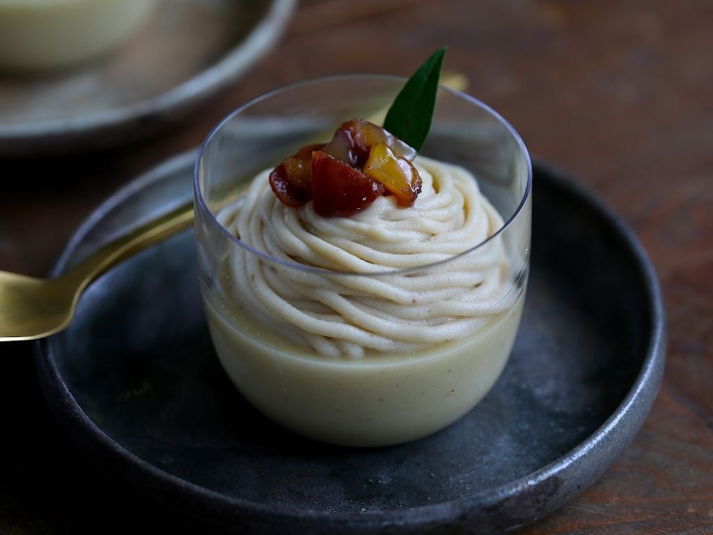植物由来の食材のみを使用した、グルテンフリー&ヴィーガンの期間限定プリン。オリジナルの豆乳カスタードクリームに和栗ペーストを合わせて作ったプリンに、優しい栗の味が広がる和栗ペーストを絞った秋を感じる贅沢なプリンです。