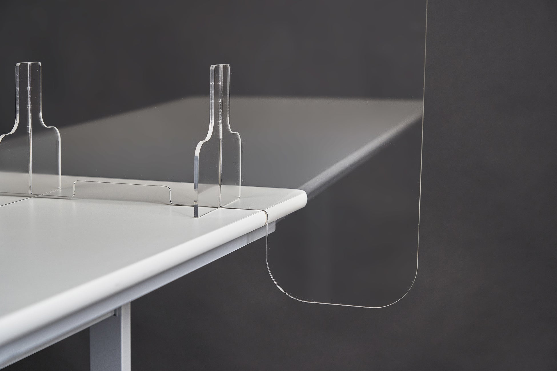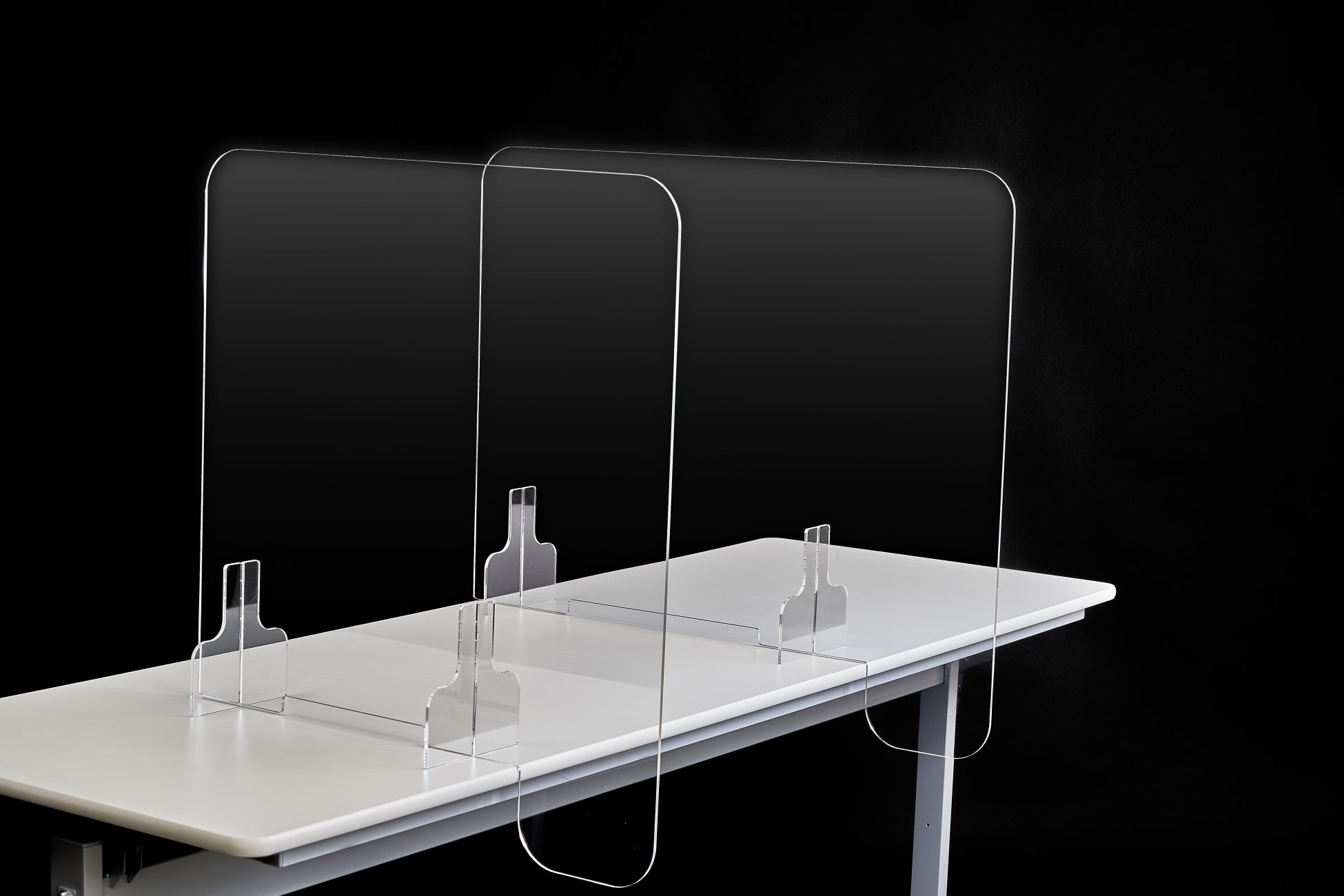 10cmの袖落ち(飛び出し)部分があるため側面からの飛沫をブロックし、隣の人との会話や作業も安心して行えます。また、透明度の高いアクリル素材なので、左右に一つずつ設置しても圧迫感がなく、角を丸く加工しているので安全です。