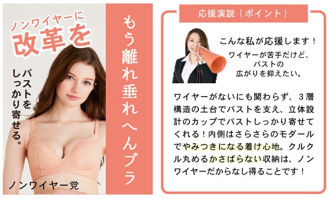 カタログの表紙をかけて13タイプのブラジャーたちが激突。お気に入りのブラに投票して女性のバストに明るい未来を!各立候補ブラのマニフェストやスタッフによる応援演説にもぜひご注目ください。
