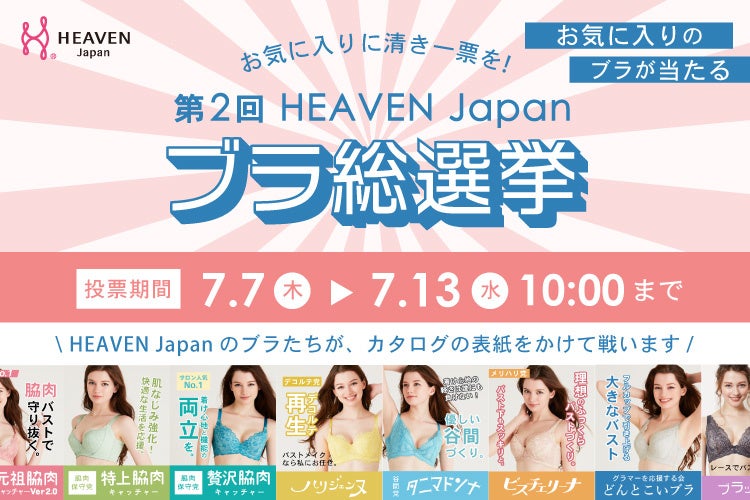 一人ひとりの女性の心と体に寄り添う「適正下着®」の開発から販売までを行う株式会社HEAVEN Japan(所在地:大阪府河内長野市、代表取締役:松田崇)は7月7日より自社専用ページにて、カタログの表紙をかけて13タイプの立候補ブラが熱き戦いを繰り広げる「第2回 HEAVEN Japan ブラ総選挙」の投票受付を開始いたしました。