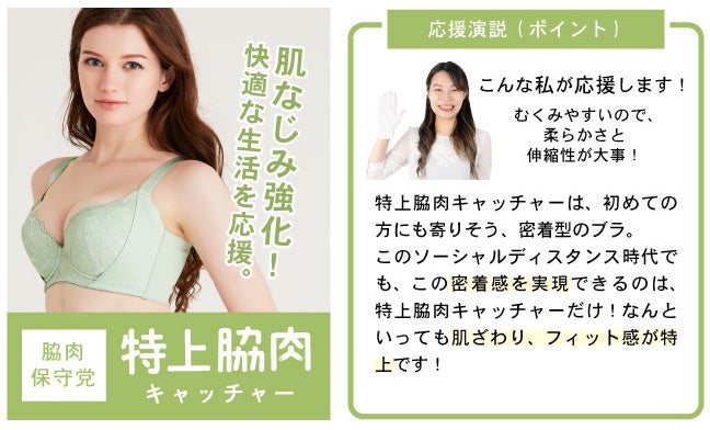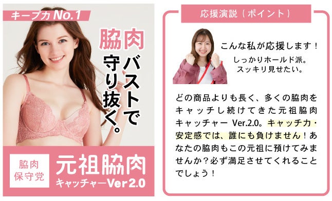 2021年11月に開催した第1回の総選挙では12タイプのブラジャーが出馬。総投票数2,794票のうち1,458票を集めた「元祖脇肉キャッチャーVer2.0」が未来のバストリーダーとして、2022年度 HEAVEN Japan春夏カタログの表紙を見事に飾りました。