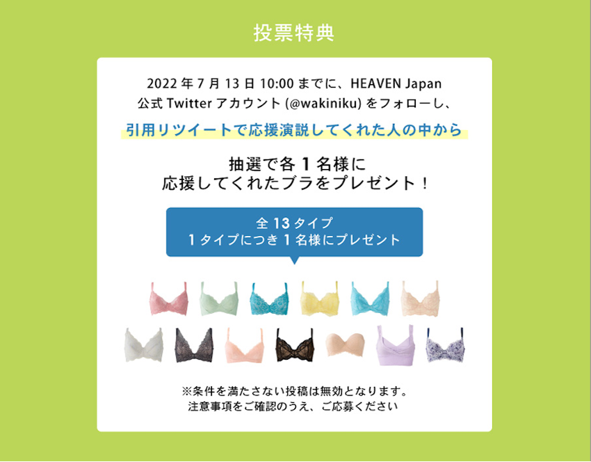 HEAVEN Japan公式ツイッター( https://twitter.com/wakiniku )から投稿されたお気に入りブラのツイートを「いいね」、またはリツイートで投票完了となります。