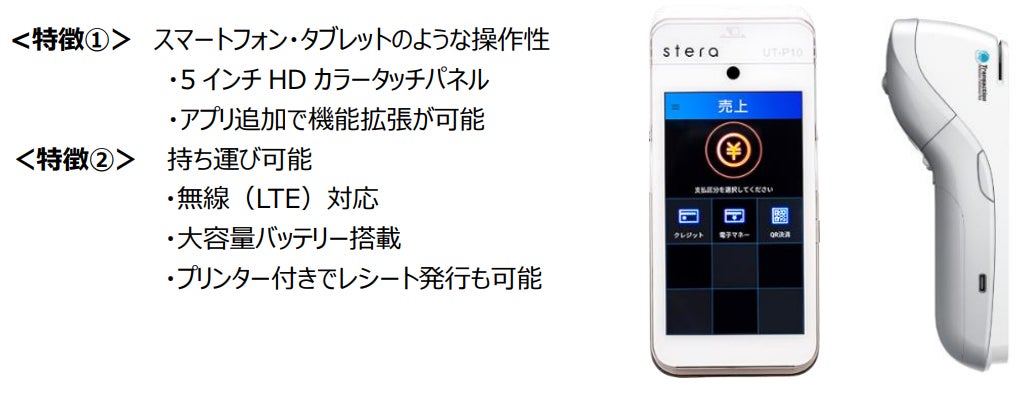 今回導入する「stera mobile」は、クレジットカード、電子マネー、コード決済などあらゆる決済サービスを取扱いが可能となるオールインワンモバイル端末です。タッチパネルを採用し、スマートフォンのような感覚で操作ができます。「stera mobile」の導入により、飲食店でのテーブル会計、アパレル店での接客時会計、訪問先での軒下会計など、様々な業態や決済シーンでご利用いただけます。