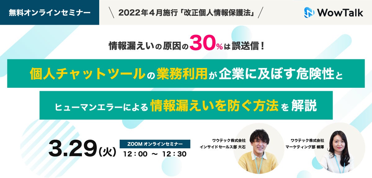 利用社数10,000社超と多くのビジネスパーソンにご利用いただいているサービス、ビジネスチャット・社内SNS「WowTalk(ワウトーク)」を開発・提供するワウテック株式会社(本社:東京都港区、代表取締役社長:瀬沼 悠、以下「ワウテック」)は、2022年3月29日(火)、無料のオンラインセミナーを開催することをお知らせいたします。