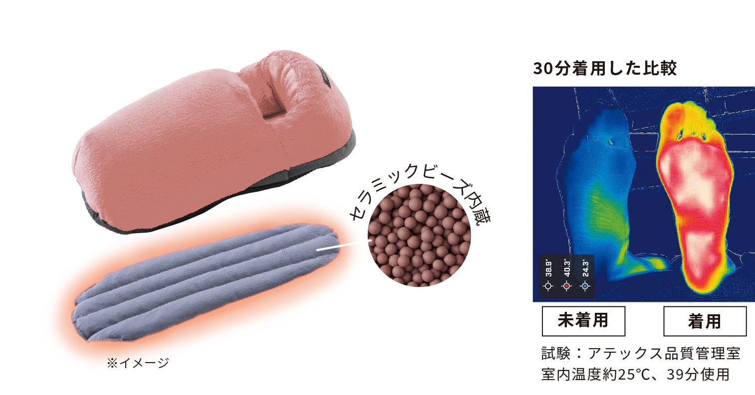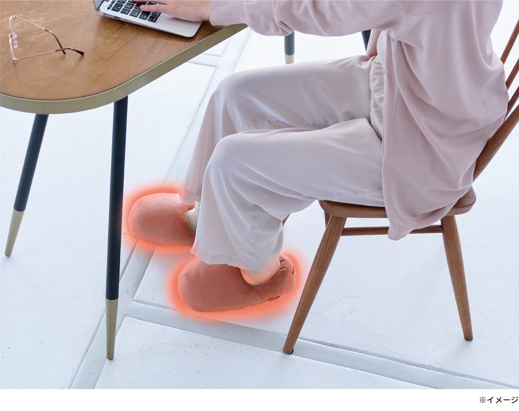 冬場は足もとが冷たくなるという方が多くいらっしゃいます。ヒーターの前で冷えた足もとを温めることがよくあ りますが、家事や部屋を移動するときなどは少し大変です。本製品はコード類や充電が必要なくルームシューズに 発熱機能をもたせることで、冷えた足もとを温めることができます。足もとが冷えたときにサッと出して使えま す。中材のセラミックビーズはザクザクとした感触で独特の心地良さです。