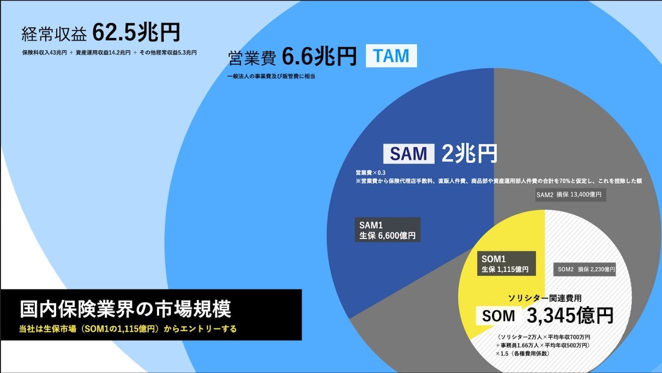 国内保険業界の経常収益は62.5兆円の巨大市場です。この中の営業費6.6兆円をTAM、その30%2兆円をSAMと定義しています。
