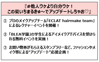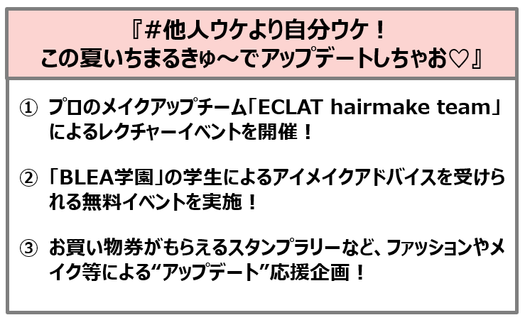 株式会社SHIBUYA109エンタテイメント(本社:東京都渋谷区、社長:石川あゆみ)は、SHIBUYA109渋谷店にて、韓国スタイルのメイクアップを得意とするプロのメイクアップチーム「ECLAT hairmake team」や、専門学校「BLEA学園」の学生によるメイクやヘアアレンジのレクチャーが受けられるイベント『#他人ウケより自分ウケ!この夏いちまるきゅ~でアップデートしちゃお♡』を8月1日(月)~8月21日(日)の期間実施します。