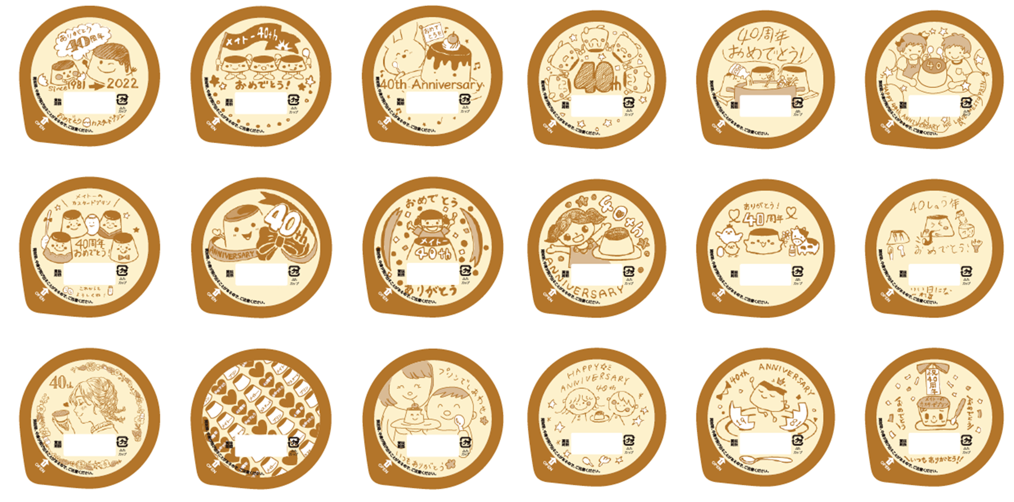 また、今回のキャンペーンパッケージのプリンふたフィルムデザインには、2021年6月に開催した「カスタードプリンふたフィルム デザインコンテスト」で応募総数1,406件の中から選ばれた優秀賞18作品を採用しました。カスタードプリン40周年をお祝いするデザインの数々を、ぜひご覧ください。