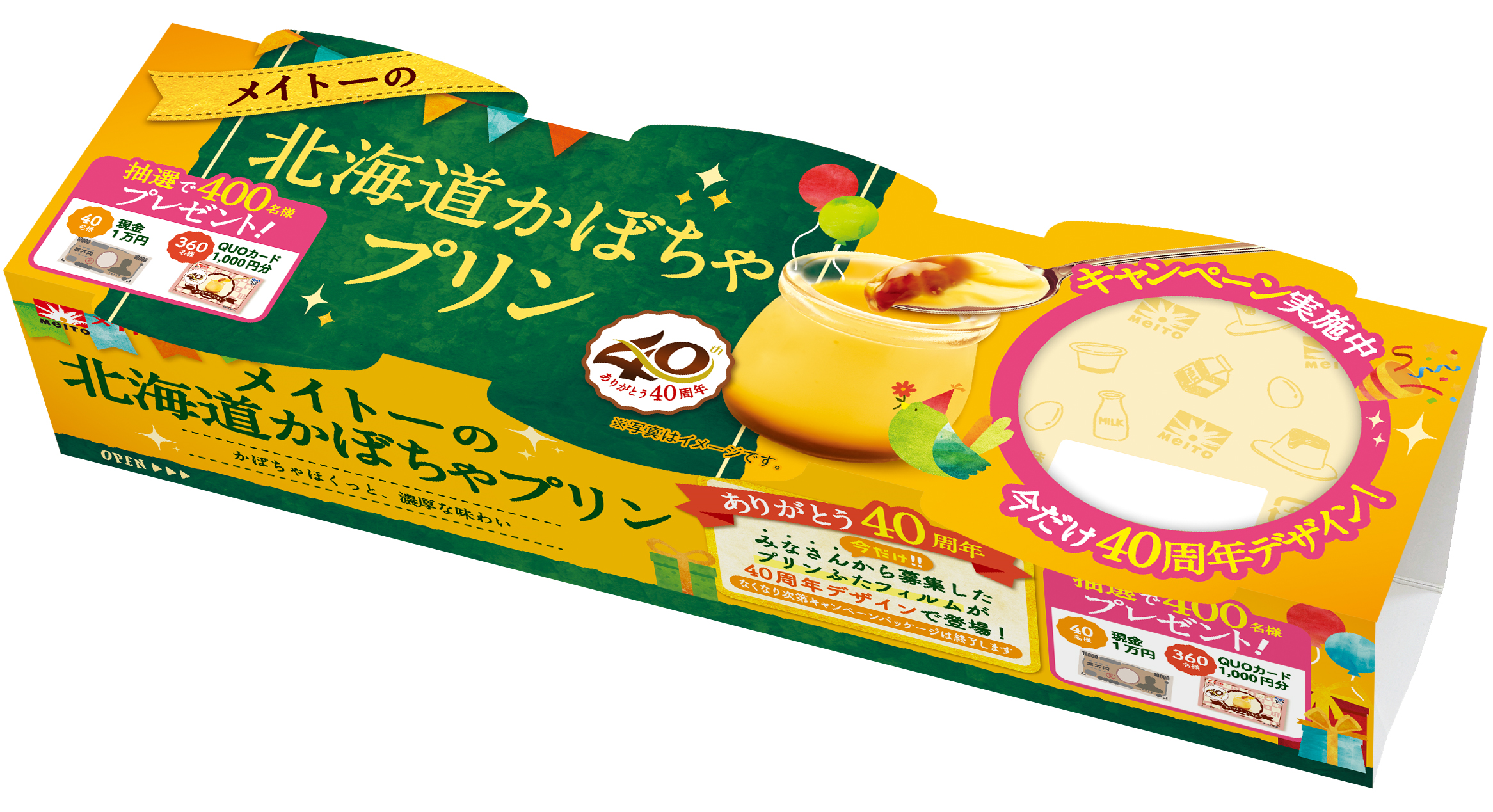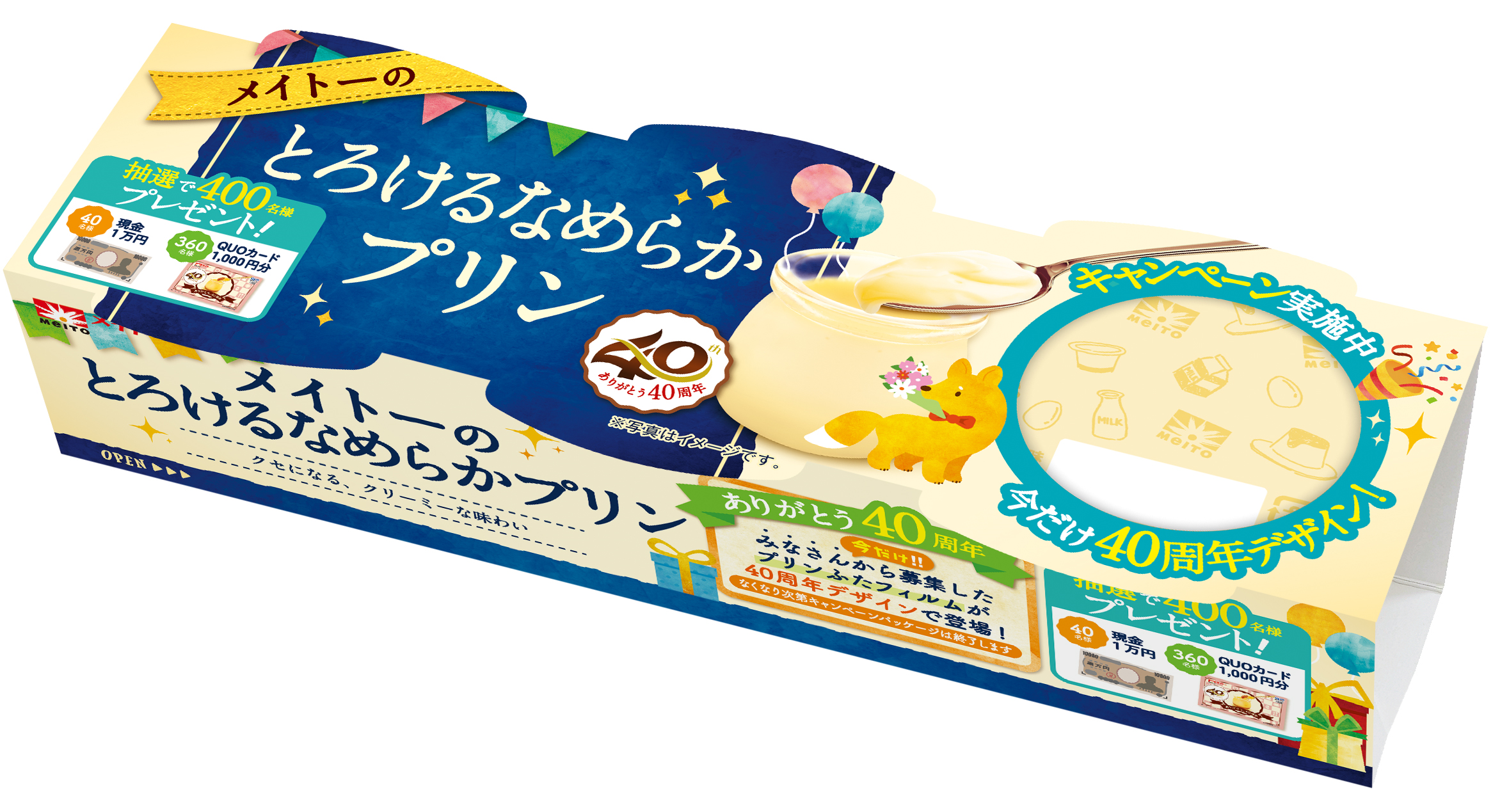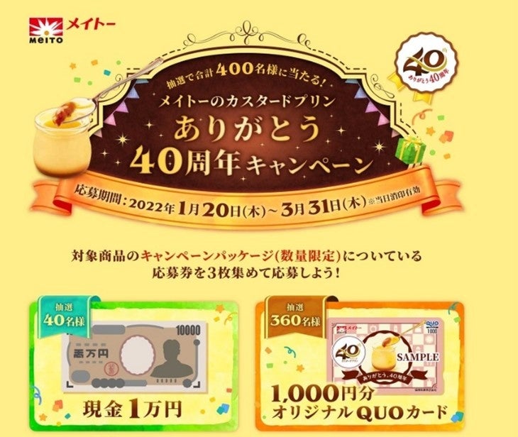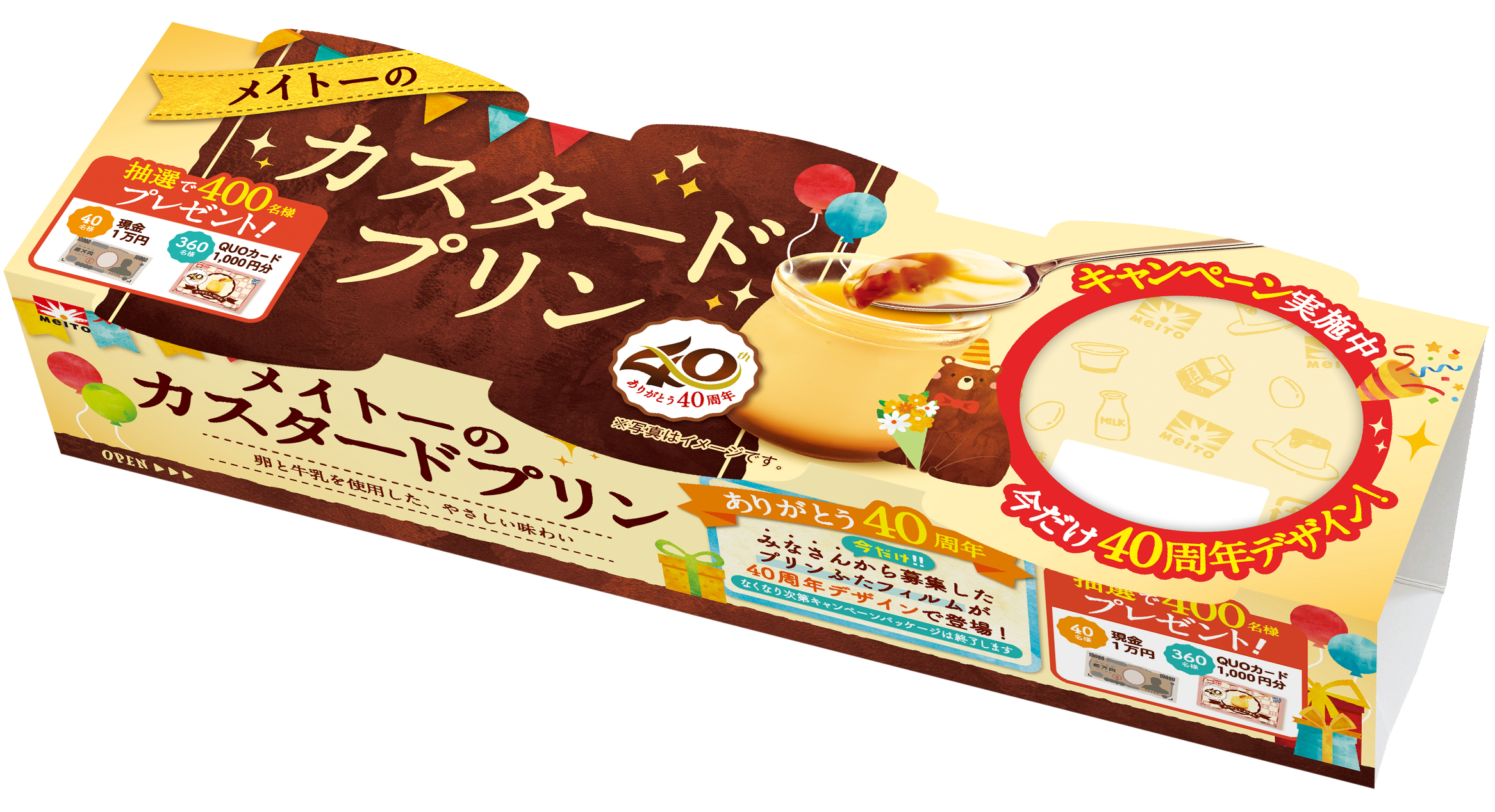 40周年の感謝を込めて実施する「メイトーのカスタードプリン ありがとう40周年キャンペーン」では、対象商品のキャンペーンパッケージ(数量限定)についている応募券を3枚集めて応募すると抽選で40名様に現金1万円、360名様にオリジナルQUOカードが当たります。