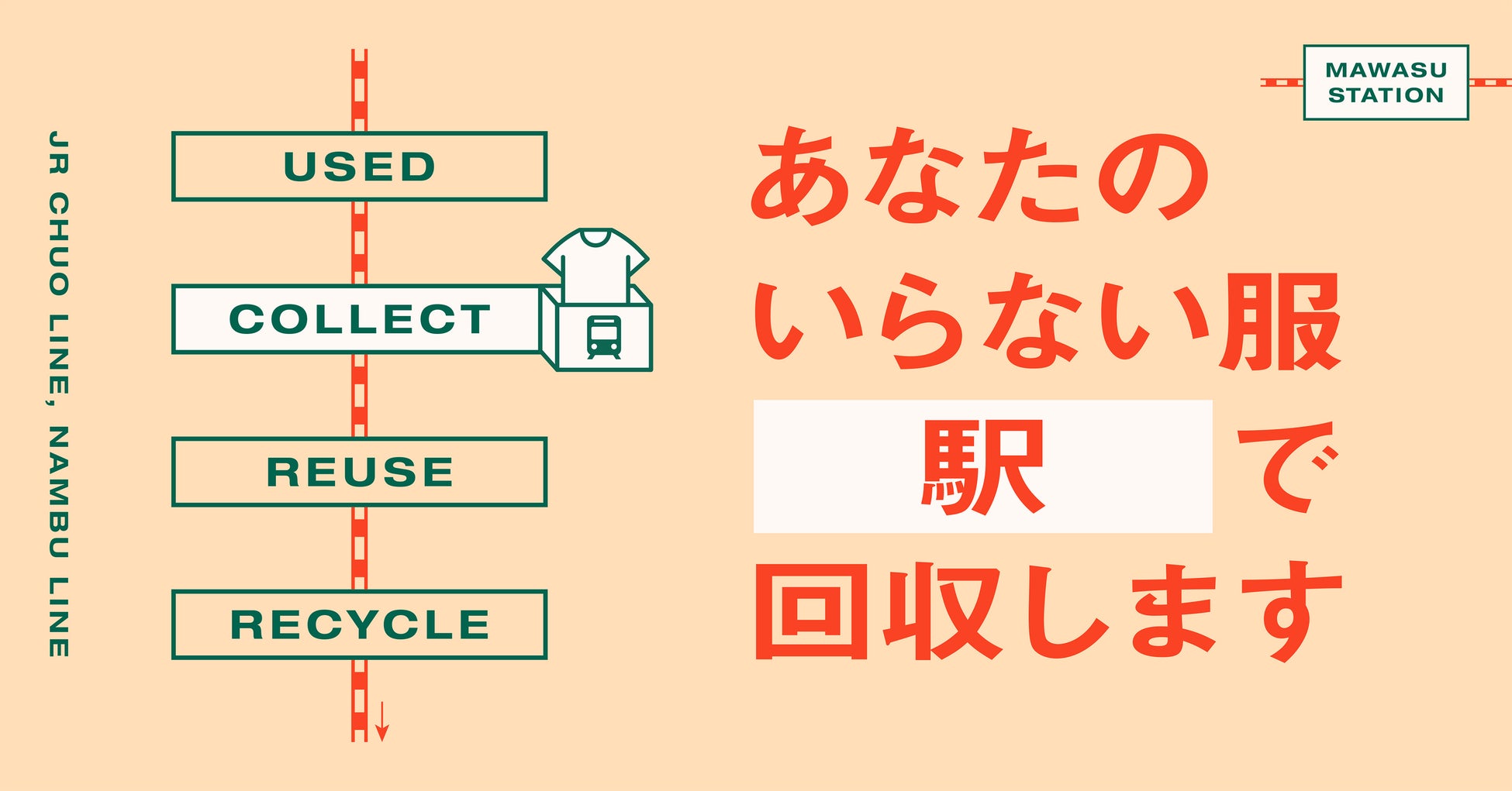JR 東日本グループの株式会社 JR 中央線コミュニティデザイン(本社:東京都小金井市、代表取締役社長:髙橋好一、以下 JRCCD)と、JR 東日本スタートアップ株式会社(本社:東京都港区、代表取締役社長:柴田裕)は、アパレルブランド「ALL YOURS」を運営する株式会社オールユアーズ(本社:東京都世田谷区、代表取締役:原康人)と協業し、SDGs 達成に向けた取り組みとして、JRCCD が運営受託している JR 中央線武蔵境駅、東小金井駅、西国分寺駅、JR 南武線稲城長沼駅の計 4 駅、及び JRCCD の駅ビルのセレオ国分寺にて、不要になった衣服の回収を行い、再利用・資源化する仕組み「MAWASU STATION」の実証実験を開始します。