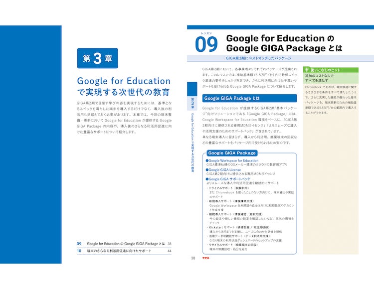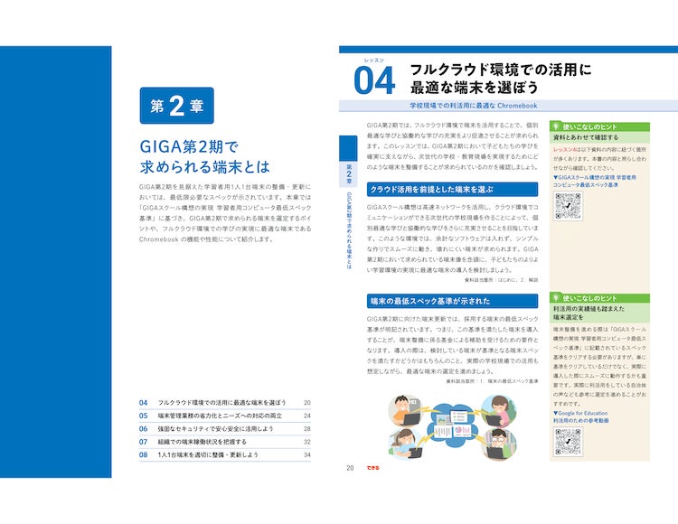 本書では、多岐にわたる『最低スペック基準』の内容をカテゴリごとにまとめてわかりやすく掲載。GIGA第2期に最適な端末を選定するためのポイントを、Google for Education の利活用事例と合わせてご覧いただけるため、基準を満たした端末の導入による「次世代の学校・教育現場」のICT利活用環境を明確にイメージしていただけます。