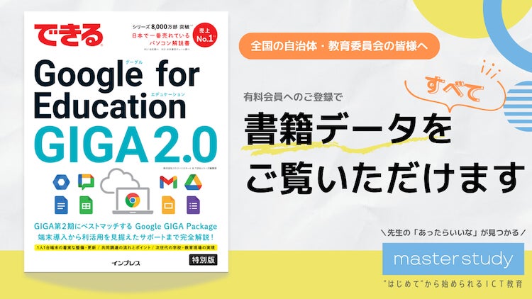 ICT教育を進める先生の「あったらいいな」が見つかる総合プラットフォーム『master study(マスタースタディ)』の有料プラン限定コンテンツページにて、大人気書籍シリーズ『できる Google for Education GIGA2.0』の書籍データを追加掲載いたしました。