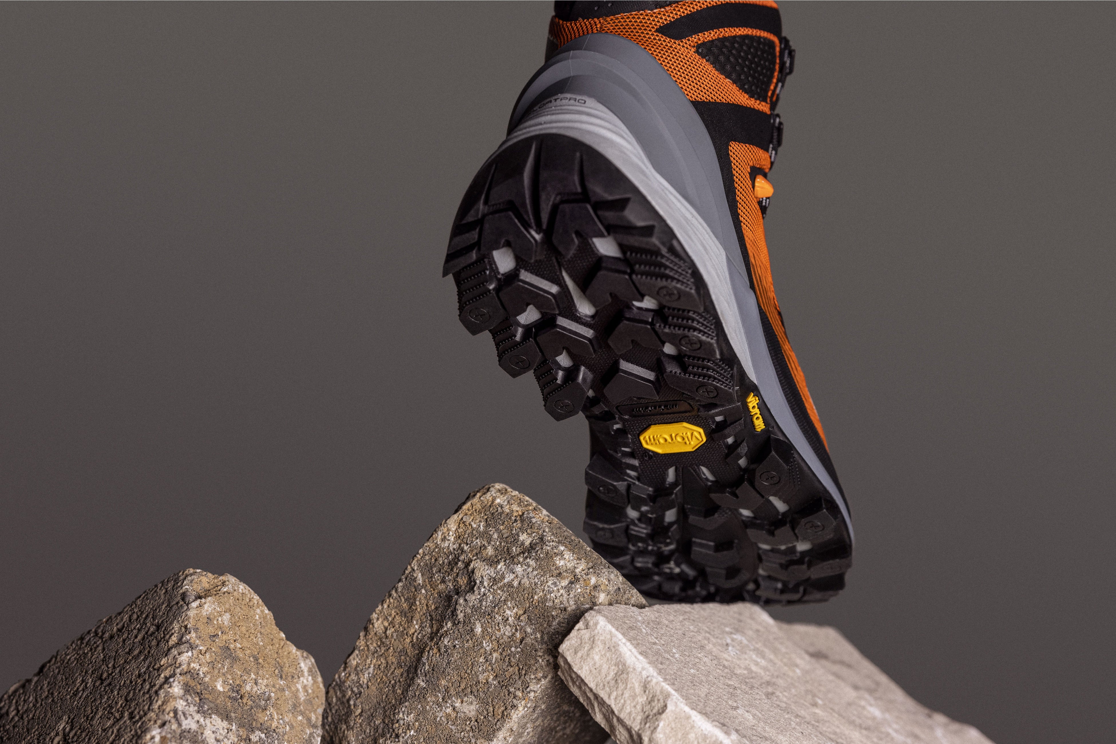 アッパーには耐久性且つ軽量性に優れたバリスティックメッシュを採用しつつ、業界随一の透湿防水性を誇る「GORE-TEX®メンブレン」を搭載。また、足首周りのフィットを高める”ロッキングバー”と”TPUヒールカウンター”を組み合わせることで、ヨコの動きに対して安心感のある安定性を発揮します。そして、ミッドソールは2つ構成パーツで構築され、トレランシューズに搭載するロックプレートから着想を得た”SカーブESSプレート”と内側と外側で硬度の分けたデュアルデンシティの「FLOATPRO™」を敷設。地表の突き上げから足を保護しつつ、従来以上の安定性とクッション性をサポートします。そして、圧倒的なグリップ力から大きな信頼を得る「Vibram MEGAGRIP」アウトソールに同社最新テクノロジーの「TRACTION LUG」を組み合わせることで、過去最高水準のパフォーマンスを発揮します。