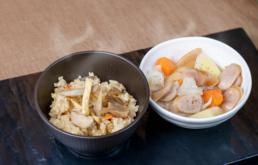 国産のうるち米を使用し、牛蒡、人参、蒟蒻、鶏肉、油揚げ、椎茸の具材とともに炊き上げました。