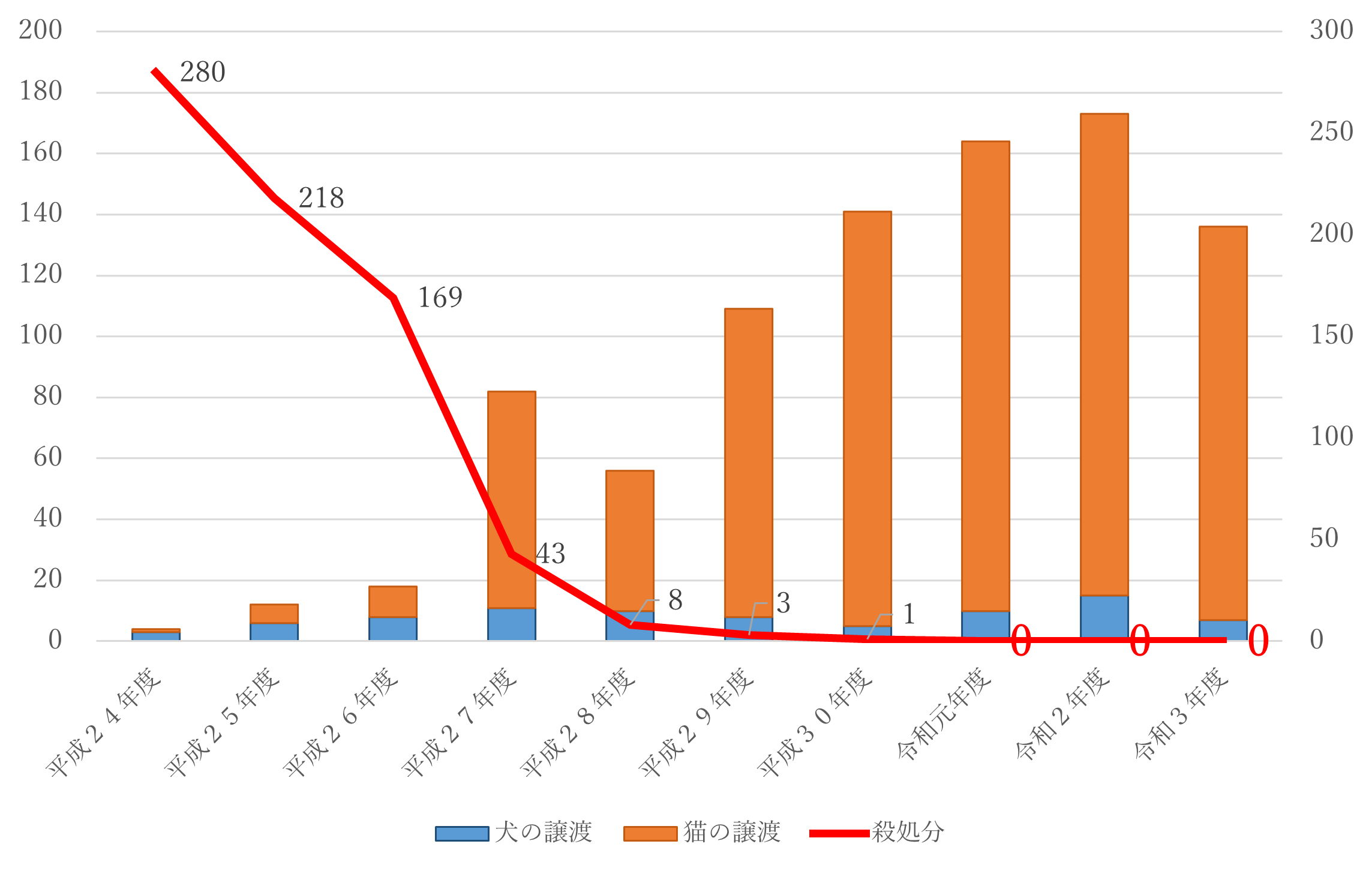 上記の表の処分のうち、譲渡数と殺処分数の経年変化をグラフにしました。10年間で「殺処分数」がゼロになっているのがわかります。