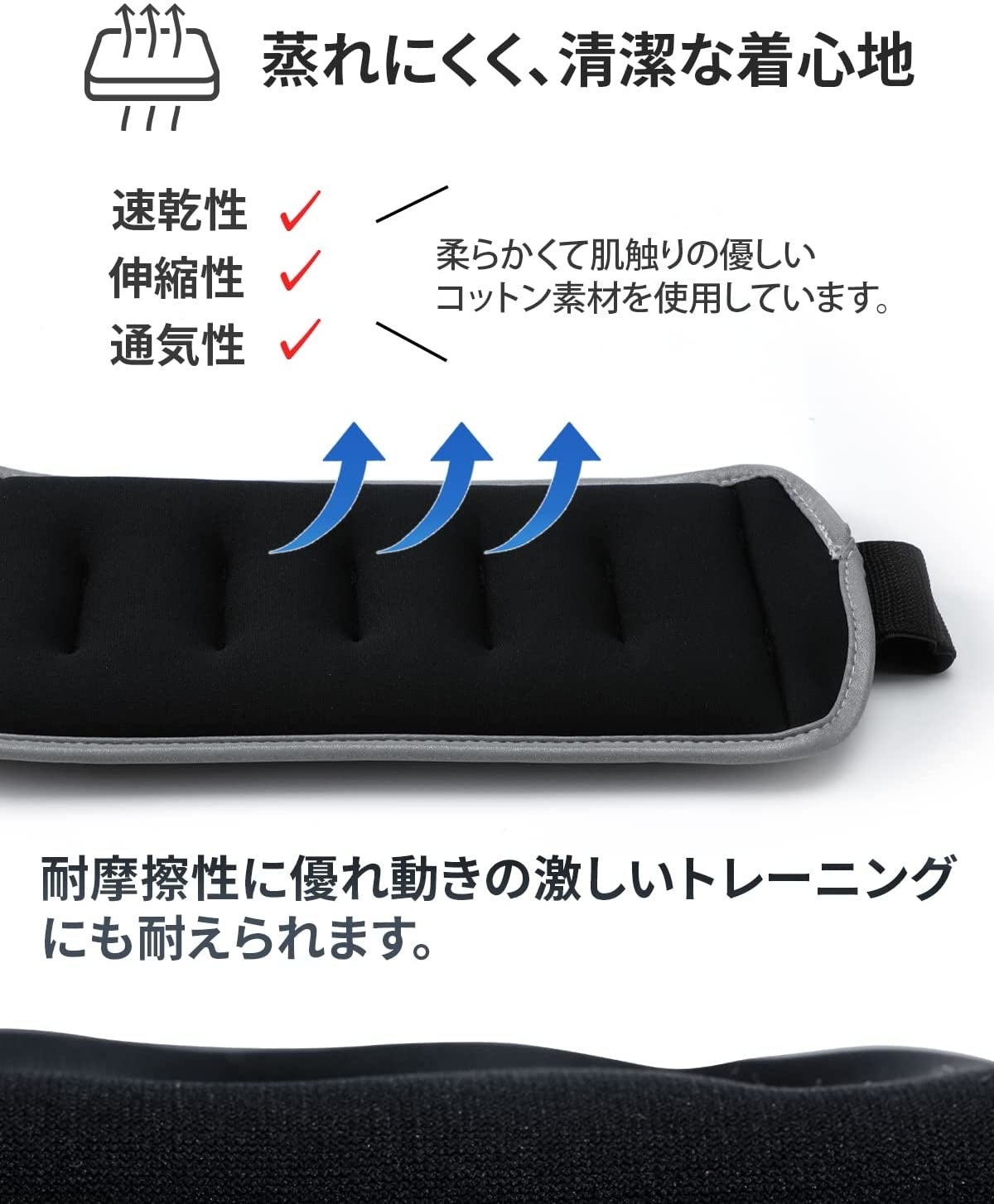 シルケット加工を施した綿を採用し、伸縮性・通気性・速乾性を向上。着用時の蒸れ感や汗の不快感を軽減させ、快適な着け心地を保ちます。ウェイトには、引裂強さと耐摩耗性に優れた、砂鉄素材を使用。本体にかかる負荷を抑え、耐久性を強化させました。しっかりと縫製を施し、砂鉄が漏れる心配もなく、長期間にわたり使用することができます。