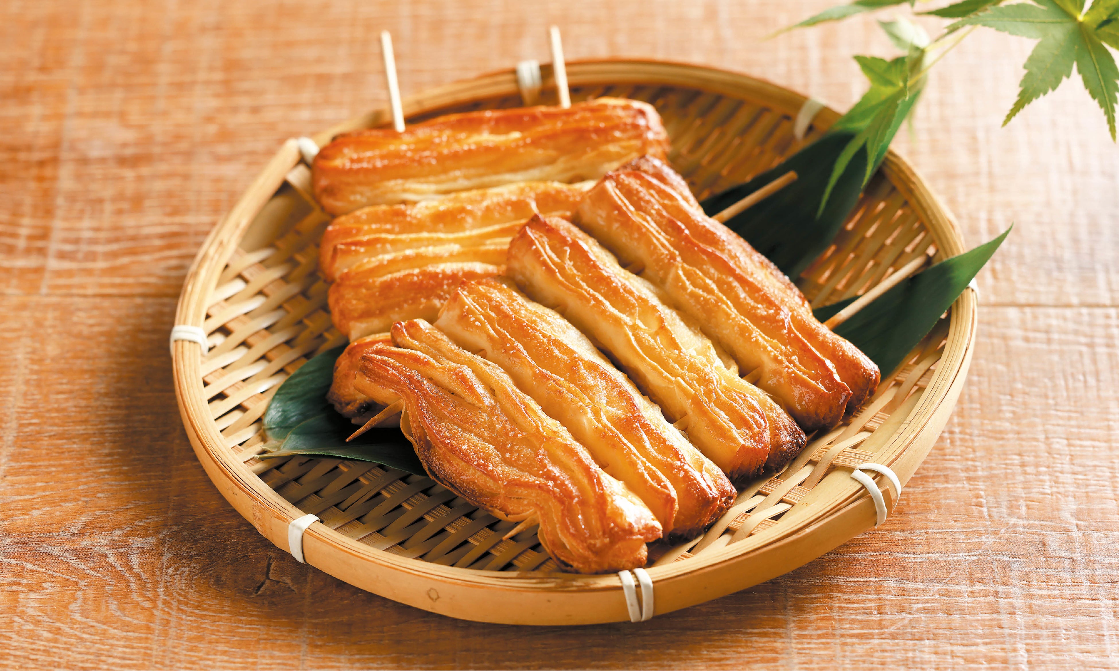 「かば焼きデニッシュ」は思わずご飯の上に乗せてしまいそうな、蒲焼きにそっくりなデニッシュです。より本物の蒲焼きに近づけるためにたれの艶感や焼き目を表現することにこだわりました。細く切ったパイシートを横に串を指すことで、パイシートの膨らむ断面を蒲焼きに見立て、仕上げにかけるメープルシロップでたれの艶感を演出し、どこから見ても蒲焼きに見えるよう仕上げました。サクサク食感とほんのり甘いデニッシュ生地に、卵を塗り、香ばしく焼き上げた後メープルシロップをかけた、見た目とのギャップを楽しめ、クセになる一品です。