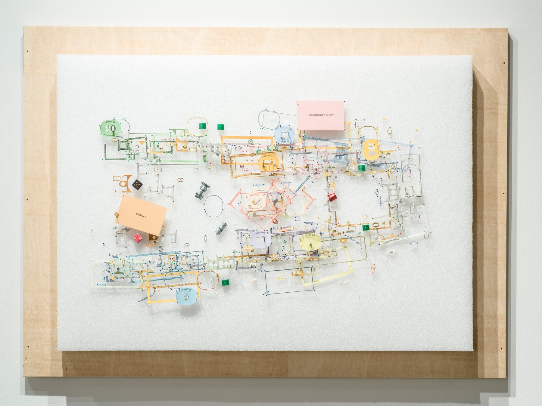 照屋の代表作のひとつ「モノポリー」シリーズ。ボードゲーム「モノポリー」のおもちゃのお金を使用し、ルーブル美術館を表現。金銭に交換できない「目には見えない価値」を可視化する試みです。