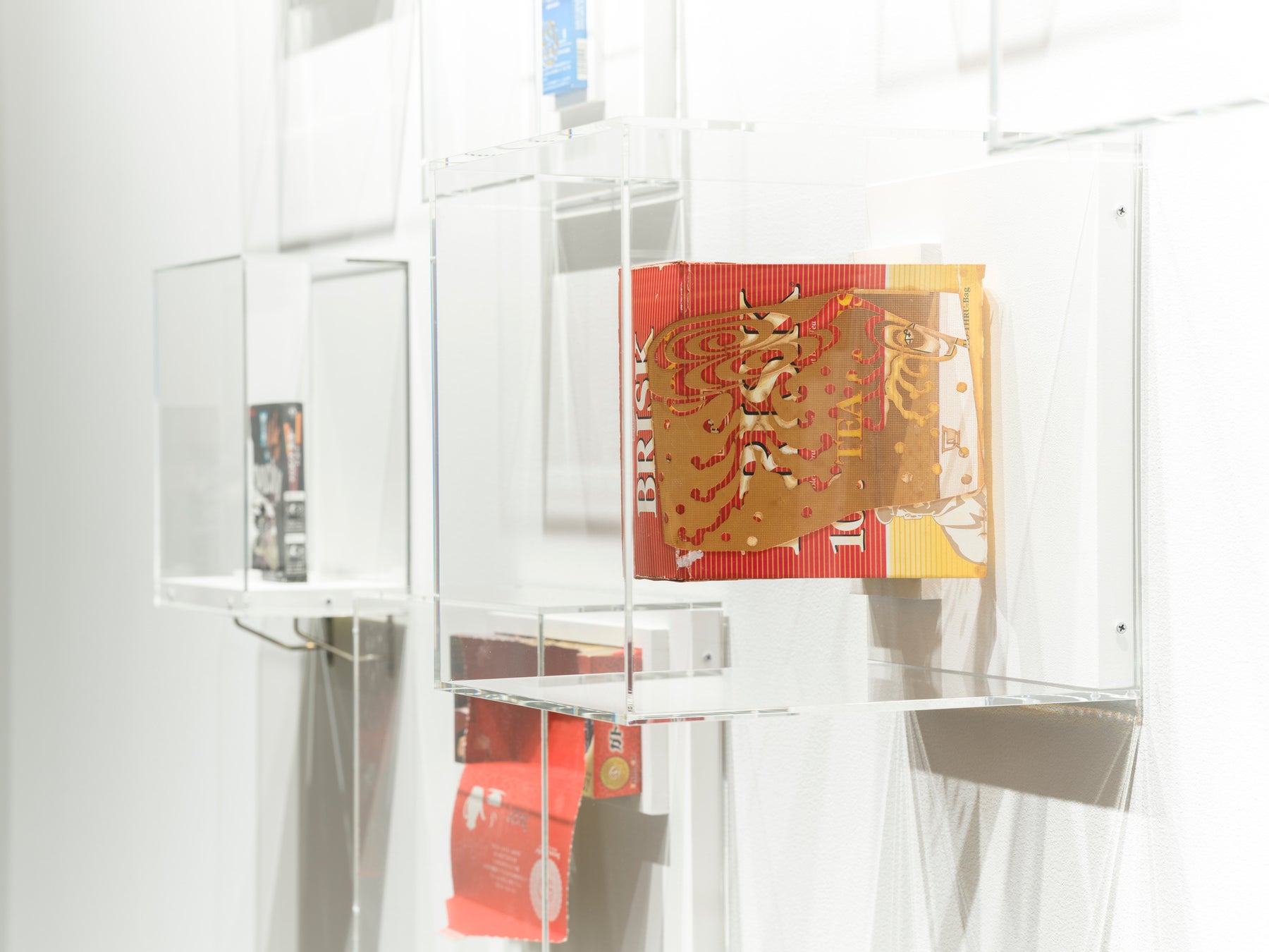 紅型制作に使用された型紙をインスタレーションとして展示。アクリルボックスは、今回のために制作された特注品。ステンシル型紙の繊細な影を鑑賞することができます。