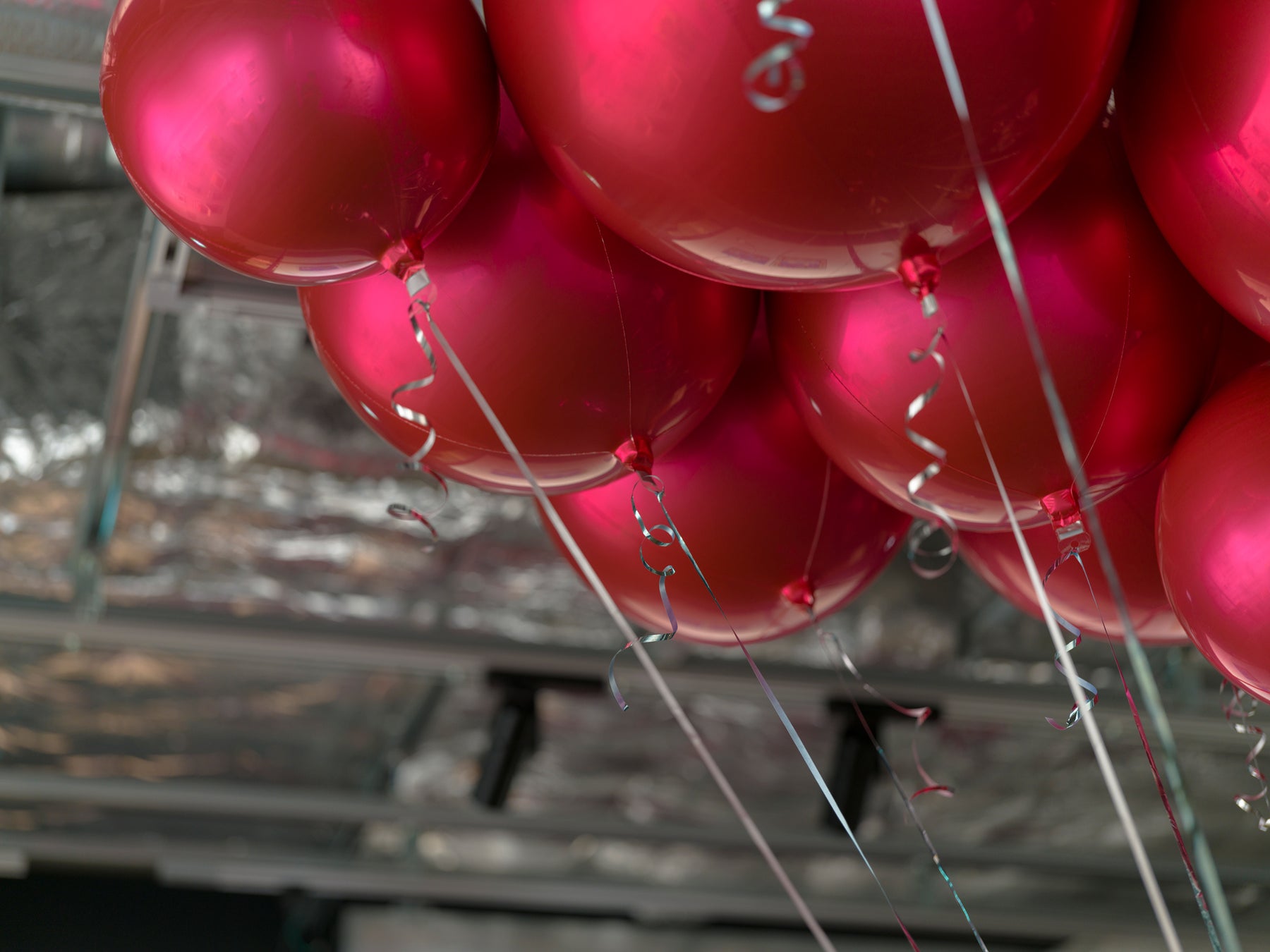 平和を希求する鮮やかな赤い風船に、実際に沖縄県南部で発見された砲弾の破片を結びつけた作品。砲弾の破片に実際に触れて体験することができます。