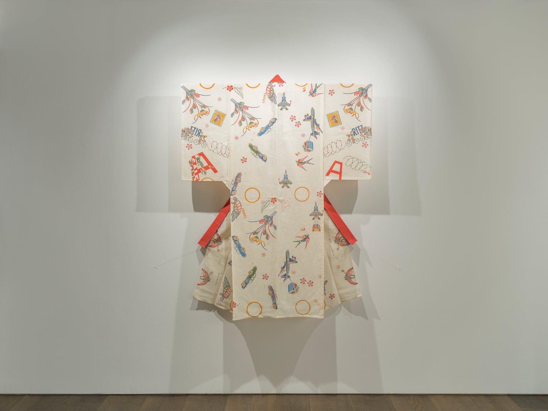 伝統的な琉球紅型の図柄の中に、戦闘機や有刺鉄線といった戦後沖縄を象徴するイメージを組み合わせた作品。同シリーズの《結, You-I》は大英博物館に所蔵されています。