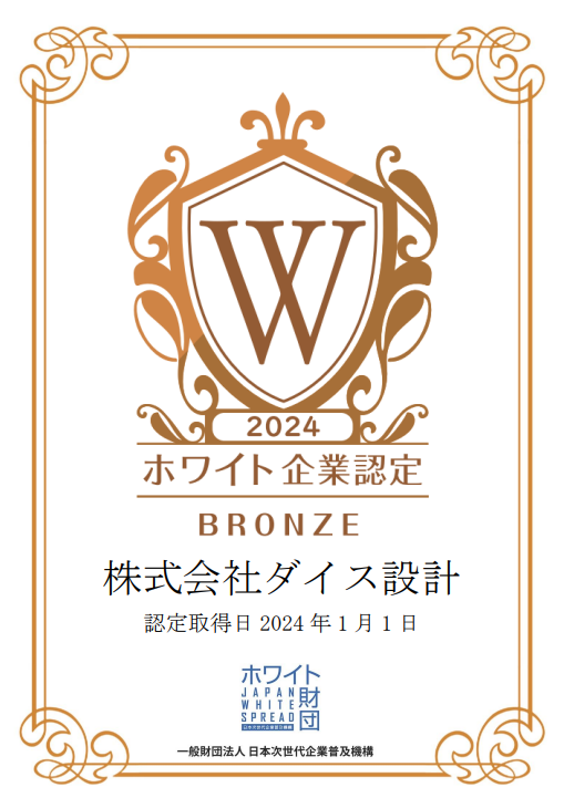 株式会社ダイス設計様が、一般財団法人日本次世代企業普及機構(通称:ホワイト財団)が運営する「ホワイト企業認定 ブロンズランク」を取得しましたことをお知らせいたします。