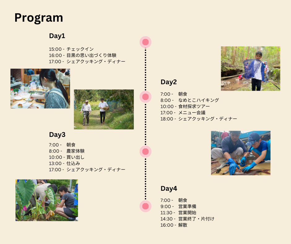 より美味しい料理を作るためにシェフたちが欠かせないことは、産地訪問です。今回はシェフと共に、松野町でジビエを加工精肉している「森の息吹」さんと宇和島市で鯛の養殖業を営んでいる「株式会社タイチ」さん、そして目黒集落で自然栽培に挑戦している仲間たちの畑を巡りながら、命との向き合い方、土と農、自然環境、気候変動など「生きる」を考える上で大切なマインドを学んでいきます。
