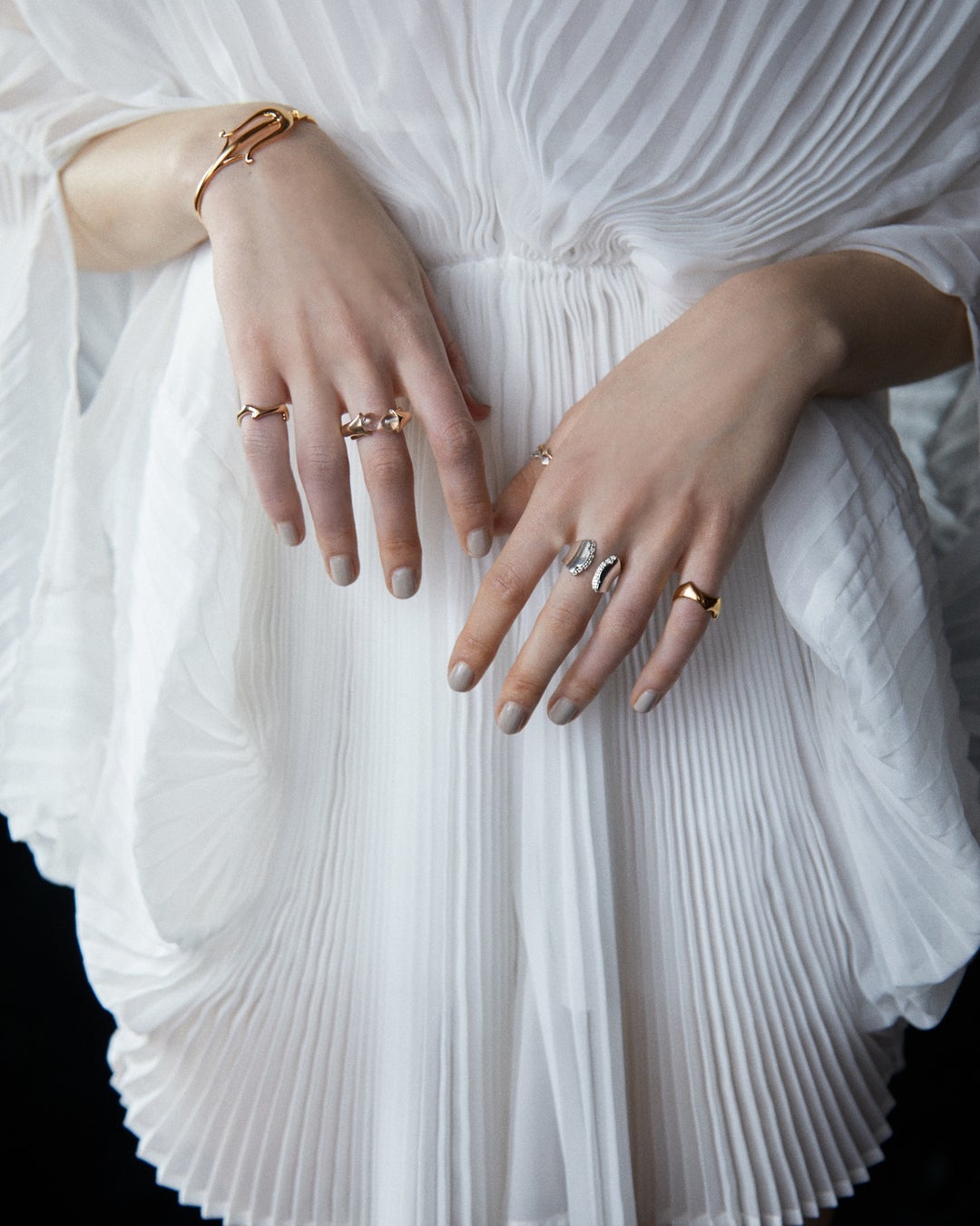 コーディネートの主役となる華やかなデザインバングル。