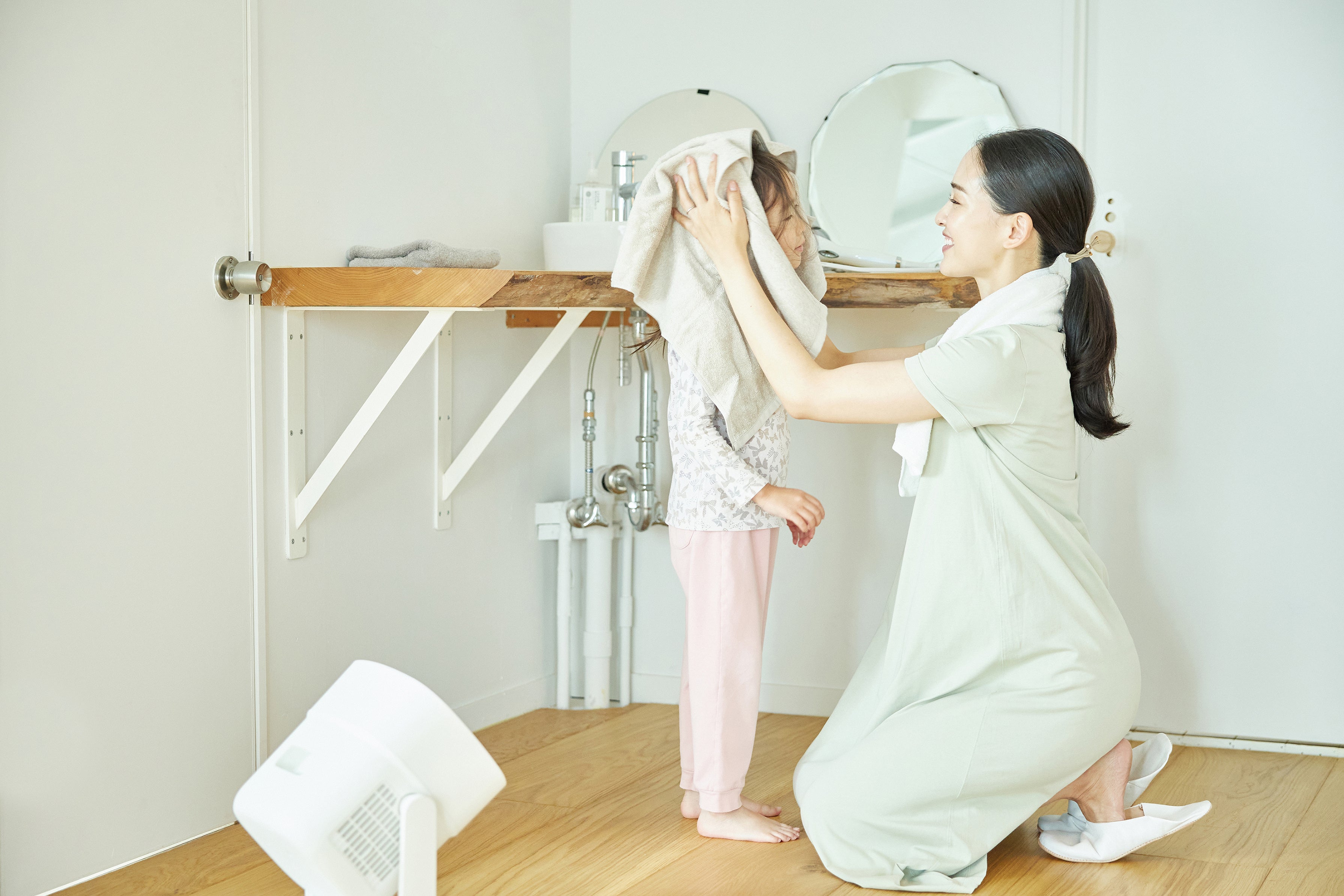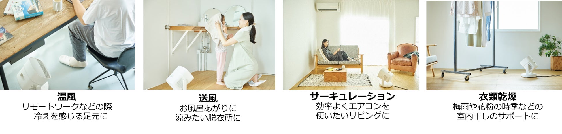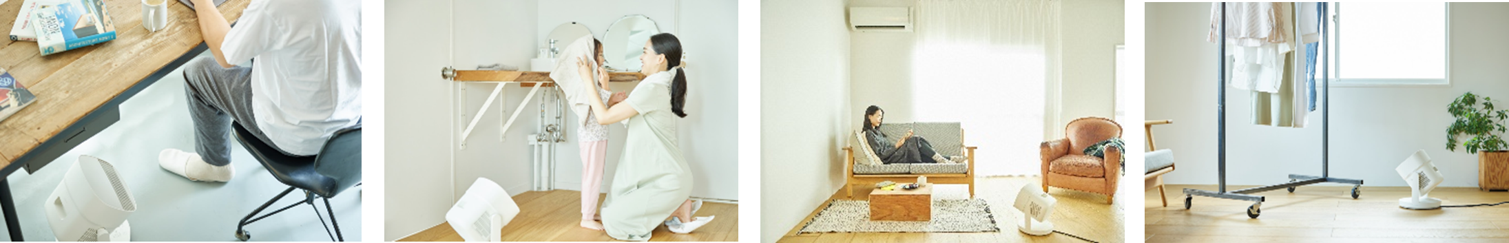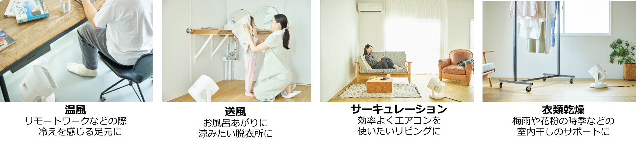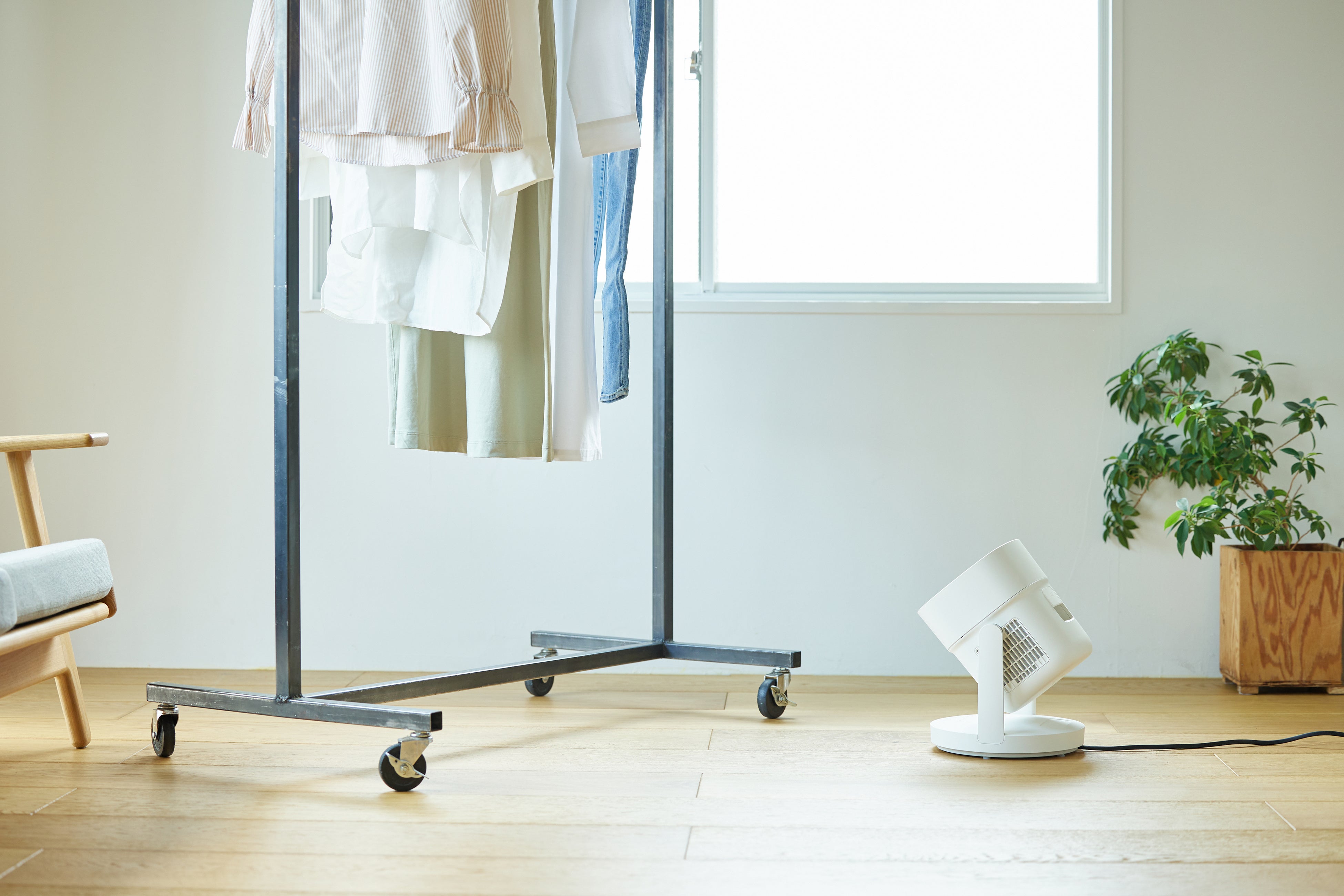 冬は「温風」でヒーターとして、夏は「送風」で扇風機として使用できます。さらに、エアコンとの併用で空気を循環させより快適なお部屋を作る「サーキュレーションモード」や、効率よく衣類を乾かす「衣類乾燥モード」も搭載し、あらゆるシーンで一年中活躍します。本体はコンパクトかつ持ち手付きなので、使用場所を選ばず、移動もらくらく。季節を問わず使えるため、収納の必要がなく、収納する手間も場所もとりません。