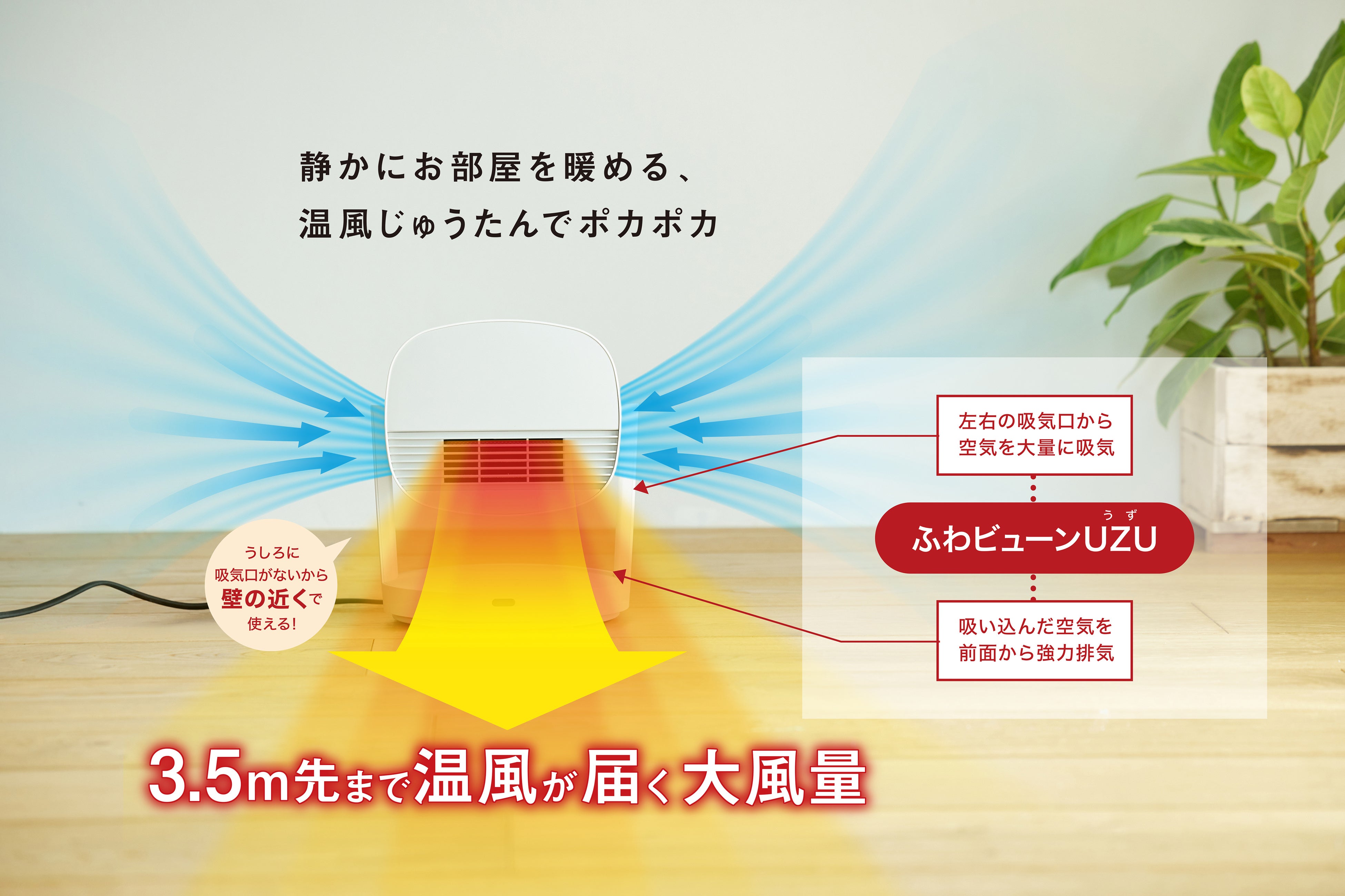 本体左右の吸気口から空気を取り込み本体前面から送風する「ふわビューンUZU(うず)」により、温風は約3.5m先まで、送風時には約20m先までパワフルな風が届きます。静音性の高さも特長で、送風風量1で運転した場合の運転音は約16dB*1、温風弱で運転した場合の運転音は約23dB*3と、木の葉の触れ合う音や、鉛筆でものを書く音などと同じレベルの静かさです。