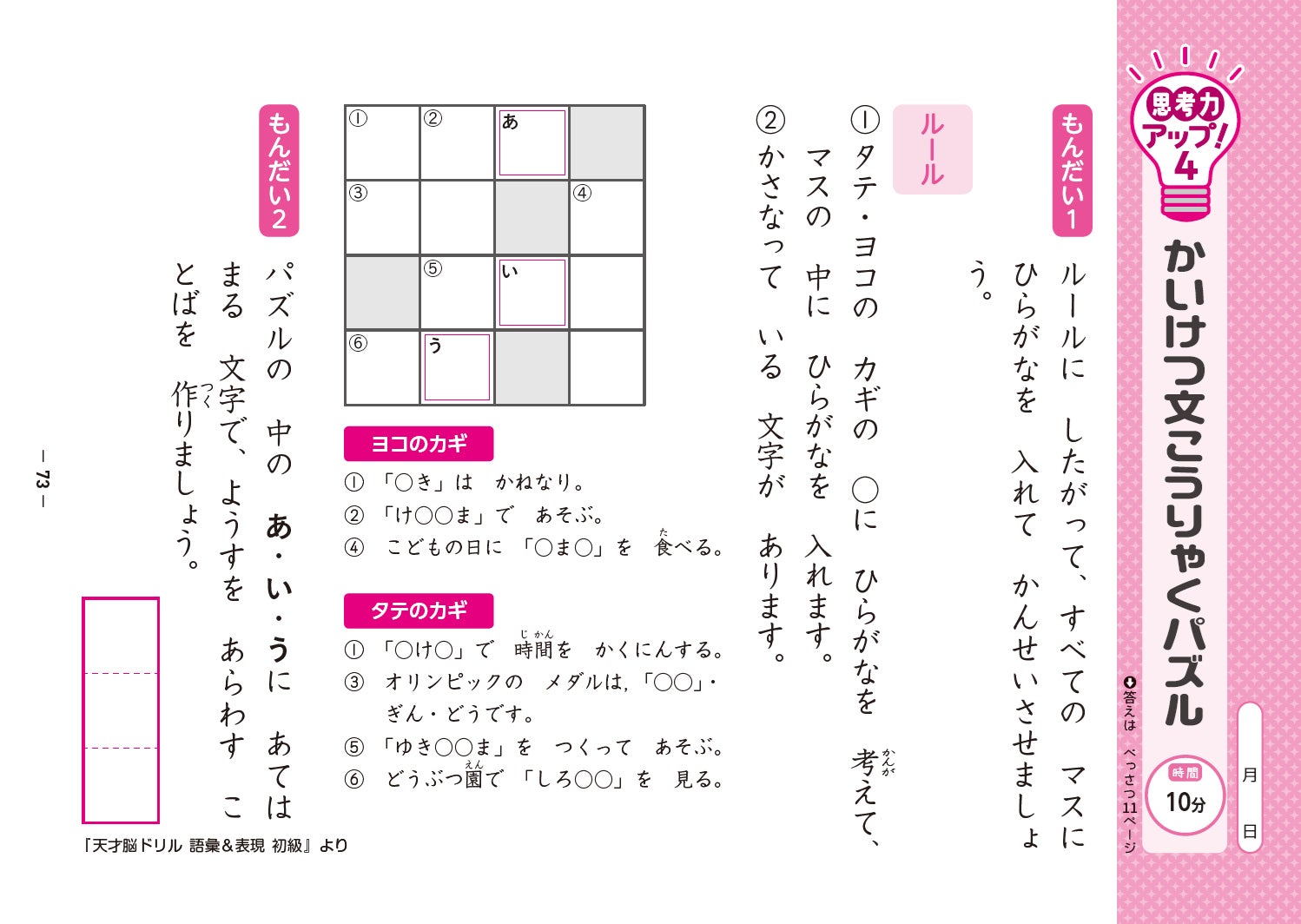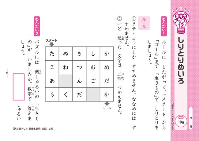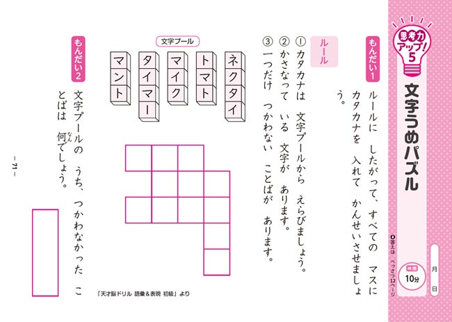 文字うめ、しりとりめいろ、とんち文字、漢字クロスワードなどで、読解力の基礎となる語彙力を複合的に養います。