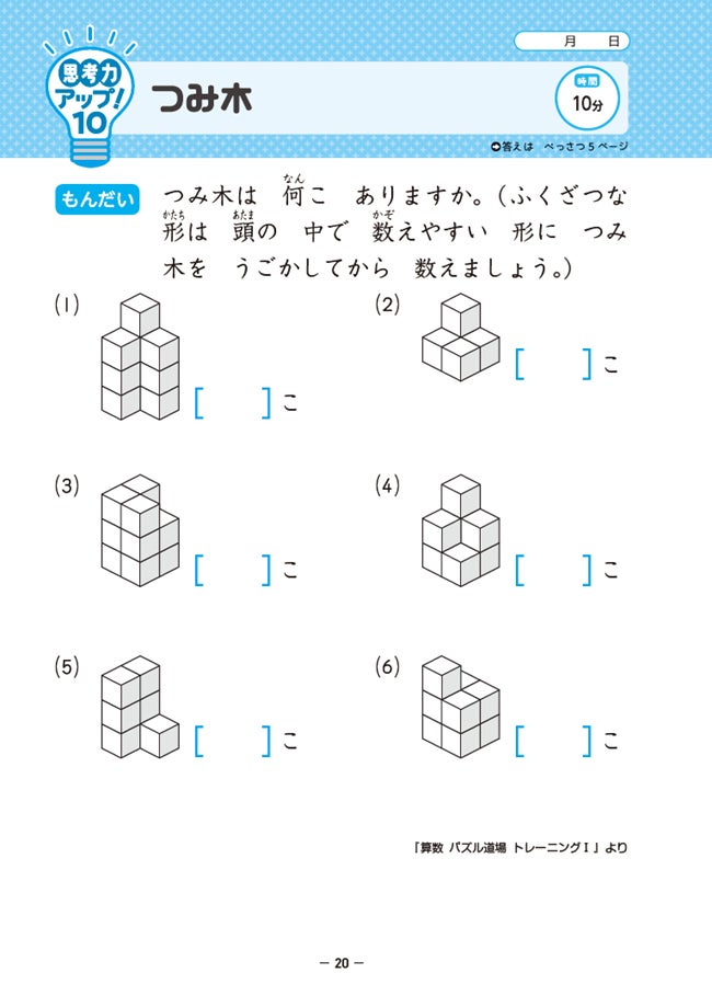 思考力が身につくパズル問題などを国語20回・算数20回で構成し、イメージしたり仮説・検証しながら考える力を育てます。