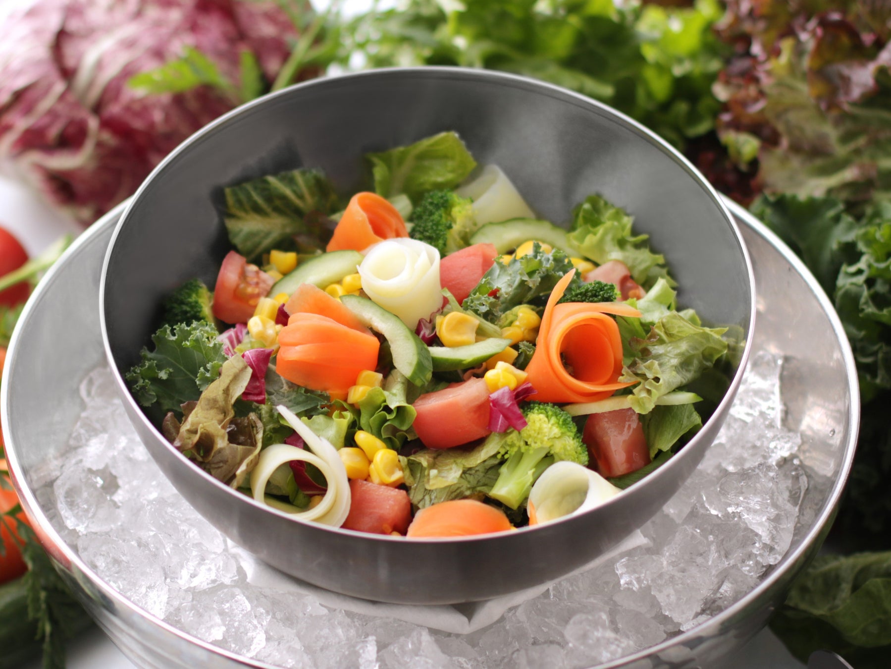氷で冷やしながら提供するサラダは、最後まで冷たくシャキシャキの食感です。彩り豊かで見た目も華やかな12種類の野菜に、数種類からお選びいただけるお好みのピエトロドレッシングをかけてお楽しみください。