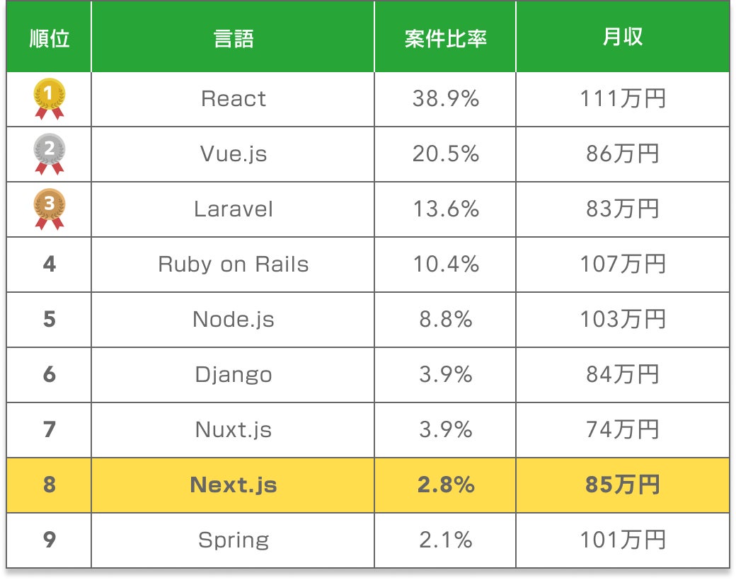 Next.jsの案件数は全体の2.8%を占めており、案件数ランキングでは8位です。この数値は、Next.jsが専門性の高い技術として位置づけられており、限られた案件の中でも一定の需要を確保していることを示しています。メジャーフレームワークに続くポジションでありながら、技術的な専門性と市場価値の高さを兼ね備えた、安定した需要が見込まれる技術分野として評価できるでしょう。