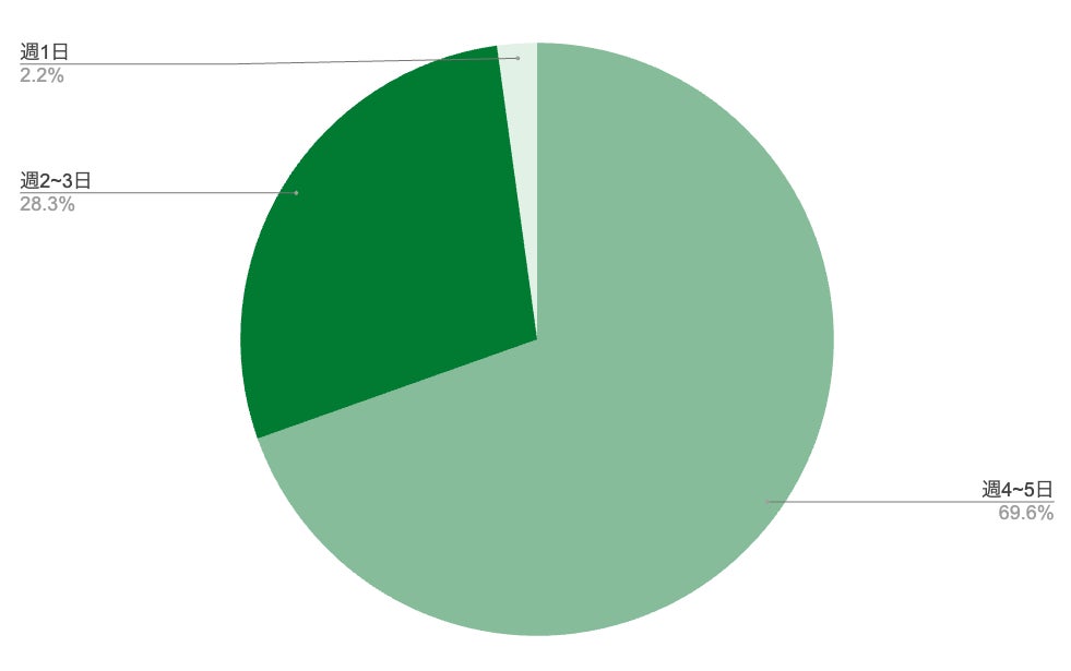 Next.js案件の稼働日数を見ると、週4~5日の案件が69.6%と最も多く、週2~3日の案件が28.3%、週1日の案件が2.2%という結果になっています。Next.js案件ではフルタイムに近い稼働を求められる傾向が強いことが分かります。