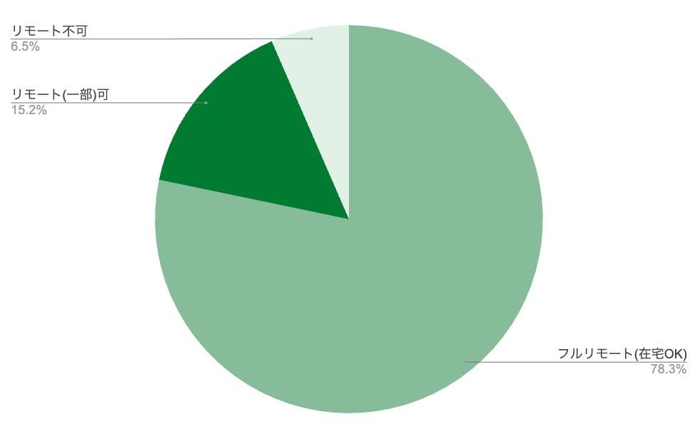 Next.js案件のリモート対応状況を見ると、フルリモート可能な案件が78.3%と圧倒的多数を占め、一部リモート可能な案件が15.2%、リモート不可の案件は6.5%となっています。つまり、93.5%の案件でリモートワークが可能という結果になりました。