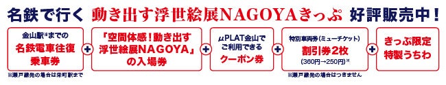 「空間体感!動き出す浮世絵展 NAGOYA」の入場券、金山駅までの名鉄往復乗車券、μPLAT金山で使えるクーポン券などがセットになったおトクなきっぷ「動き出す浮世絵展NAGOYAきっぷ」販売中。