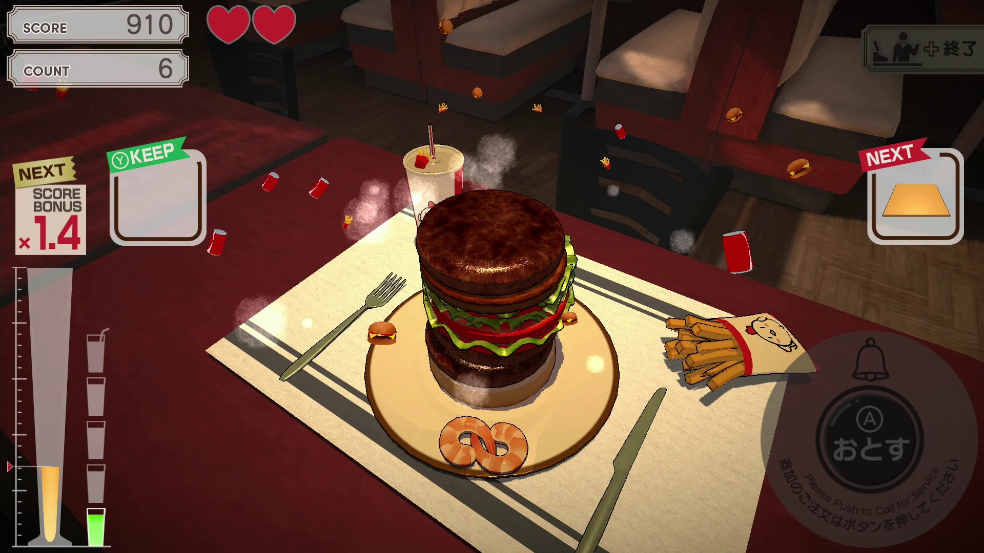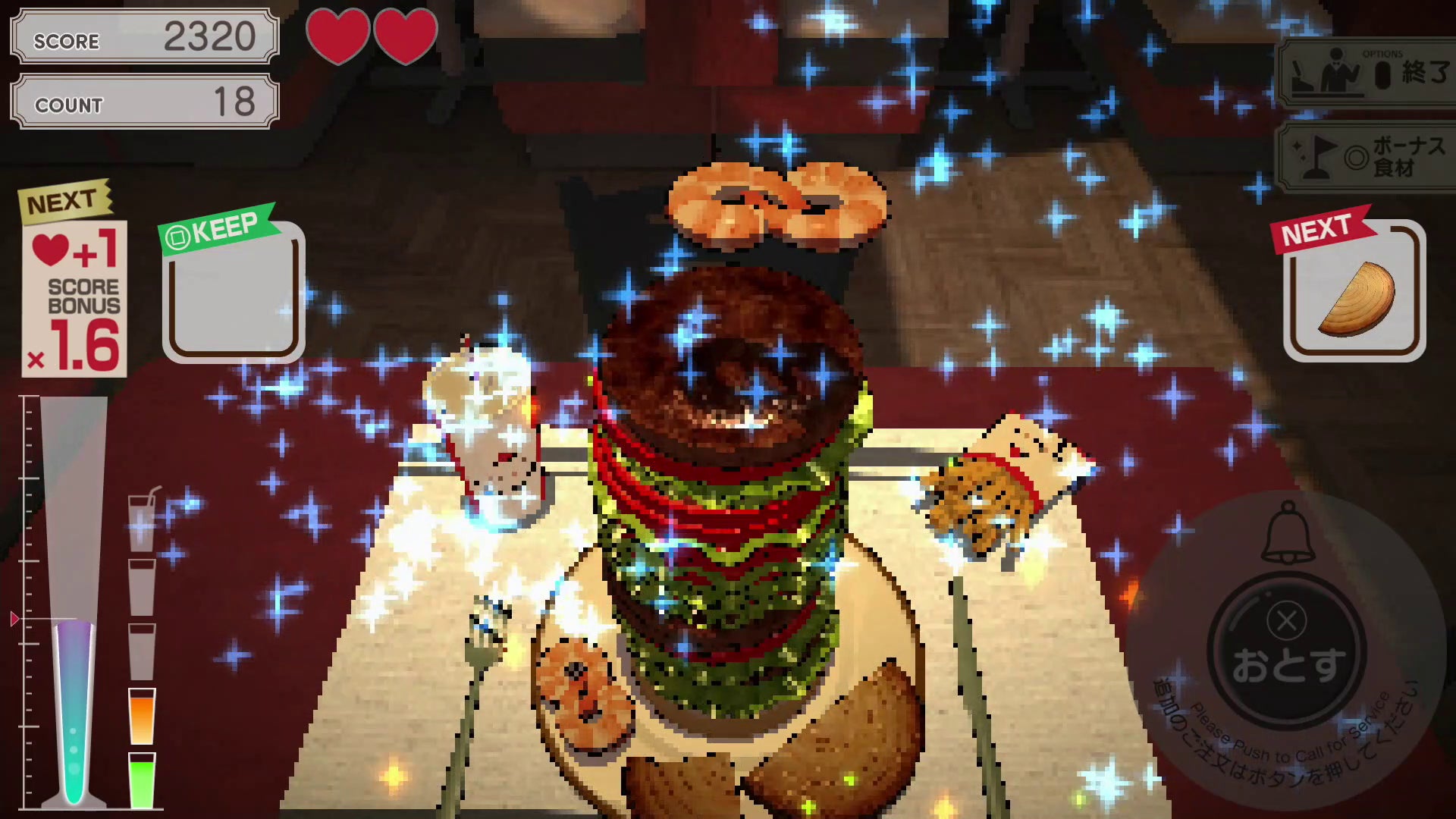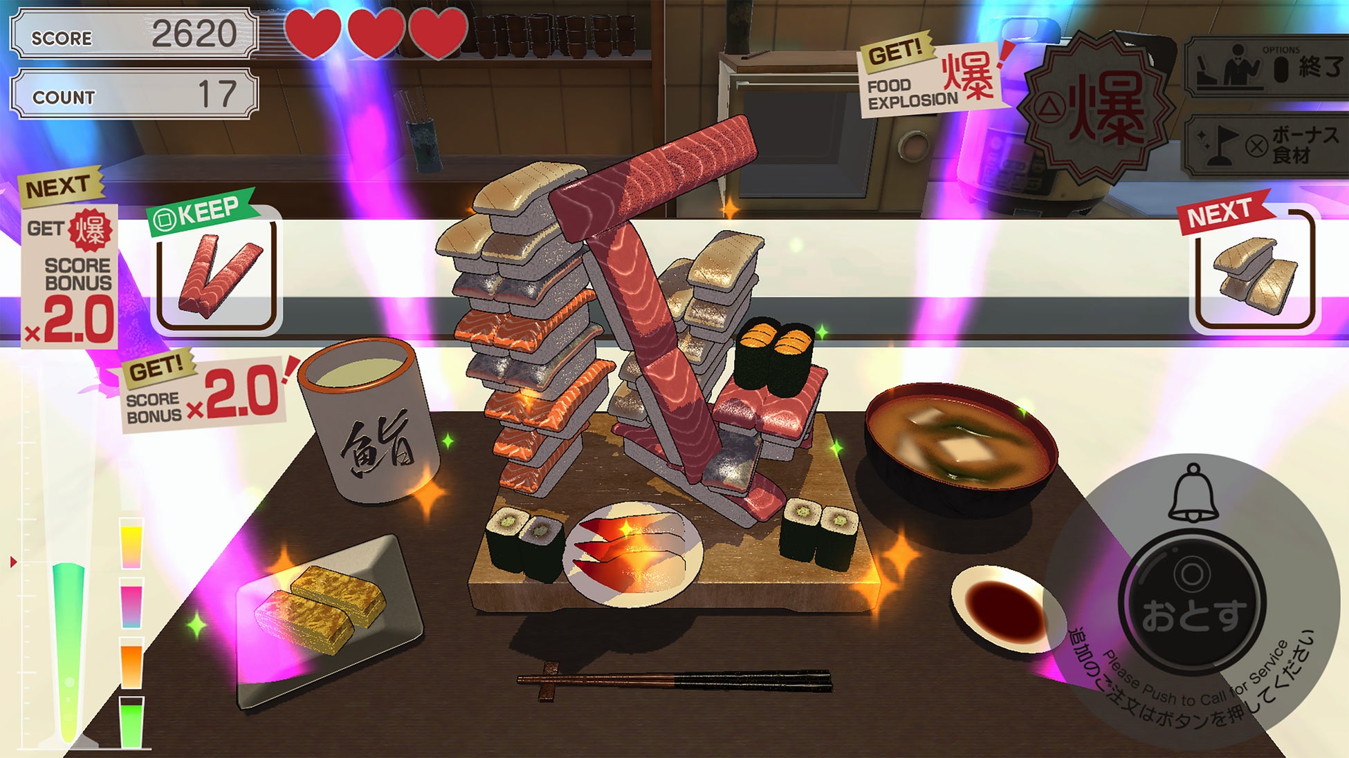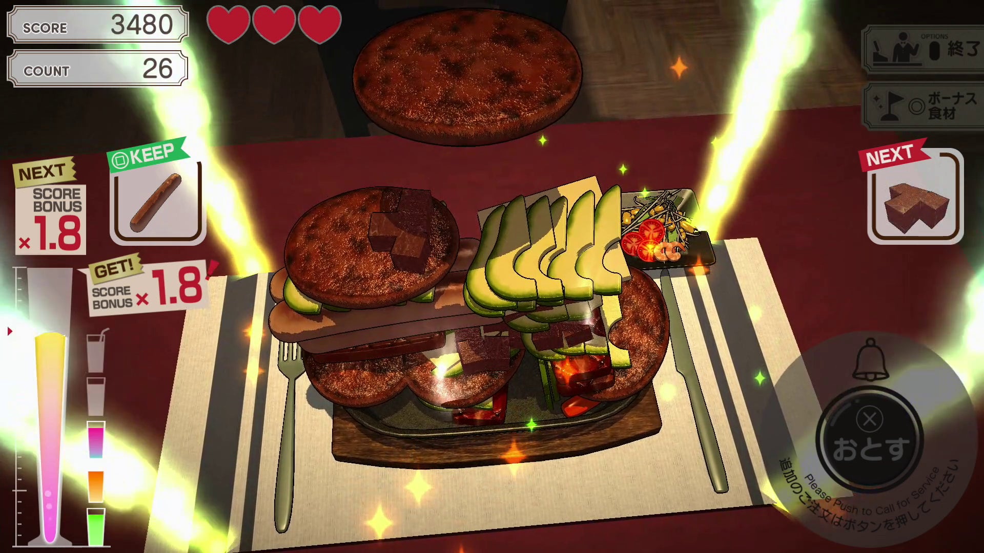 盛る食材や量、積み上げた高さによってスコアがアップし、食材がお皿から落ちてしまうとゲームオーバーとなります。