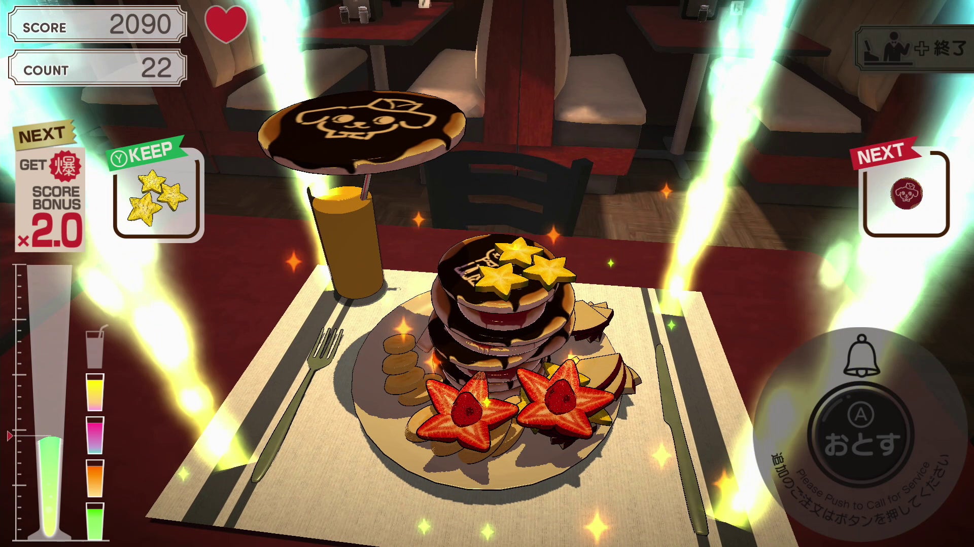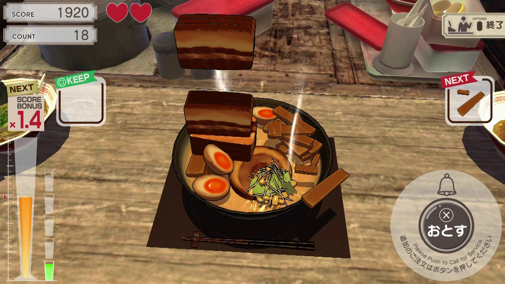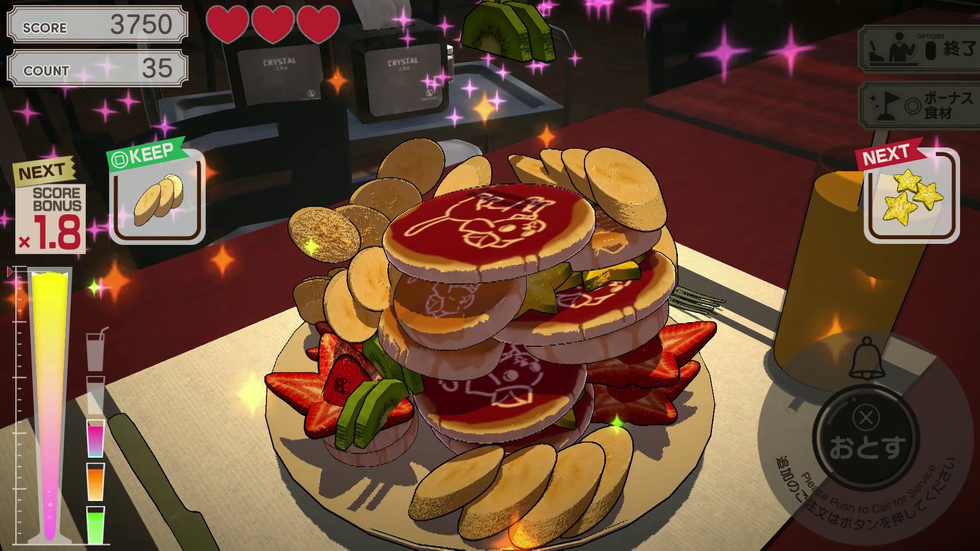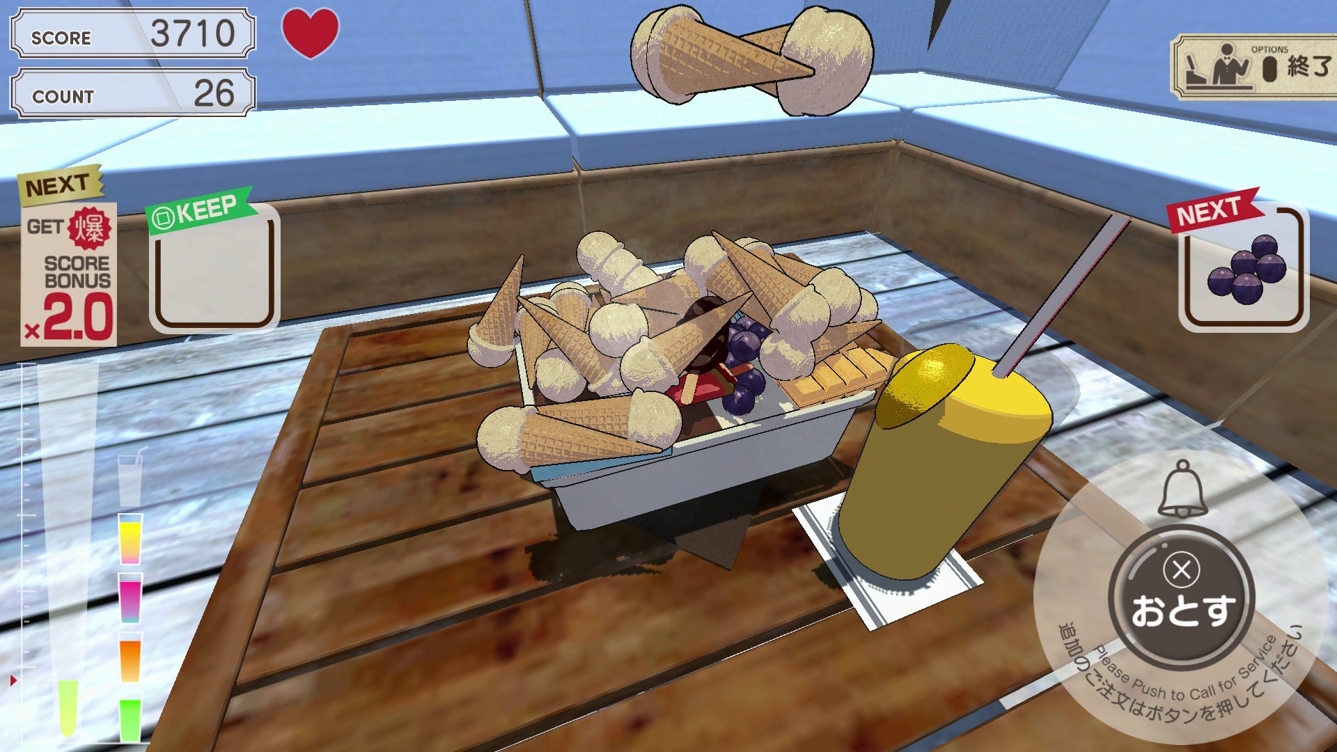 盛る食材や量、積み上げた高さによってスコアがアップし、食材がお皿から落ちてしまうとゲームオーバーとなります。