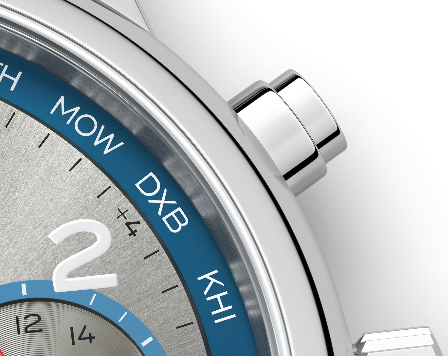 2時の位置にあるプッシュボタンは、都市ディスクと動いている時針をセットし、1回押すだけで世界を股にかける旅行を簡単にしてくれます。