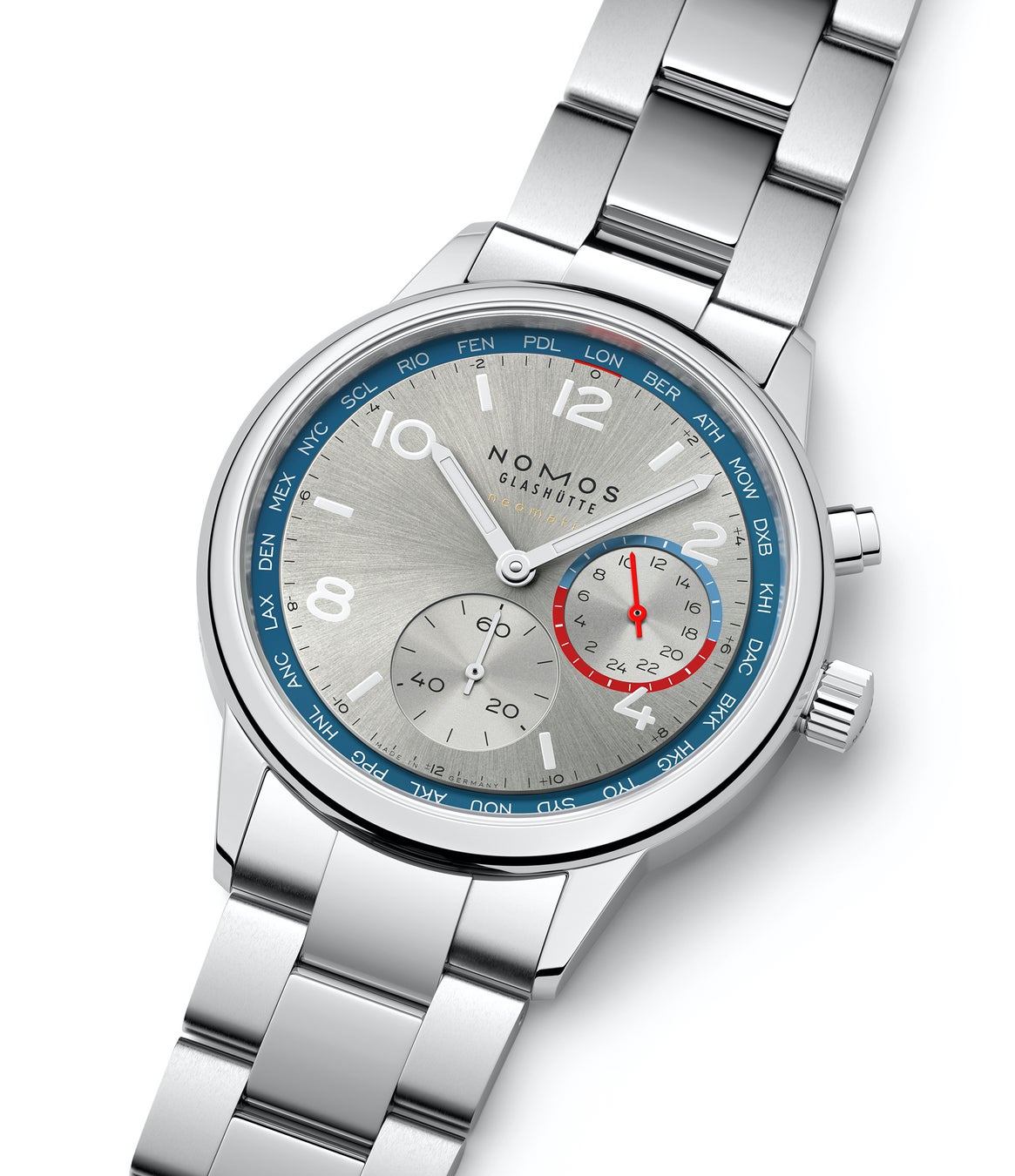 「クラブスポーツ ネオマティック ワールドタイマー」は、NOMOSの人気モデル「クラブスポーツ」の堅牢なエレガンスを初めてワールドタイム機能と組み合わせた、世界を股にかける人のための新しい腕時計です。スポーティーでありながらエレガント、一目でわかる個性と使いやすさを併せ持つデザインを特徴としています。