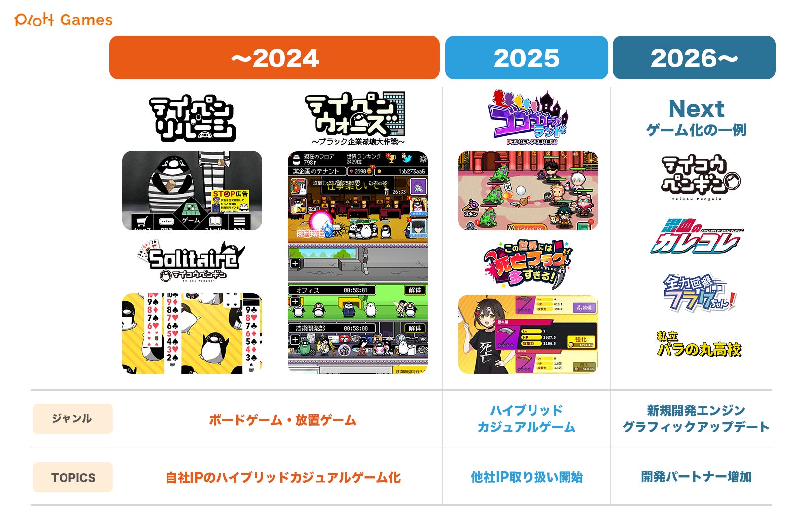 Plottは今後も中期経営計画に基づき、自社IPと他社IPのバランスを取りながら、2026年末までに多様なゲームタイトルをリリースしてまいります。