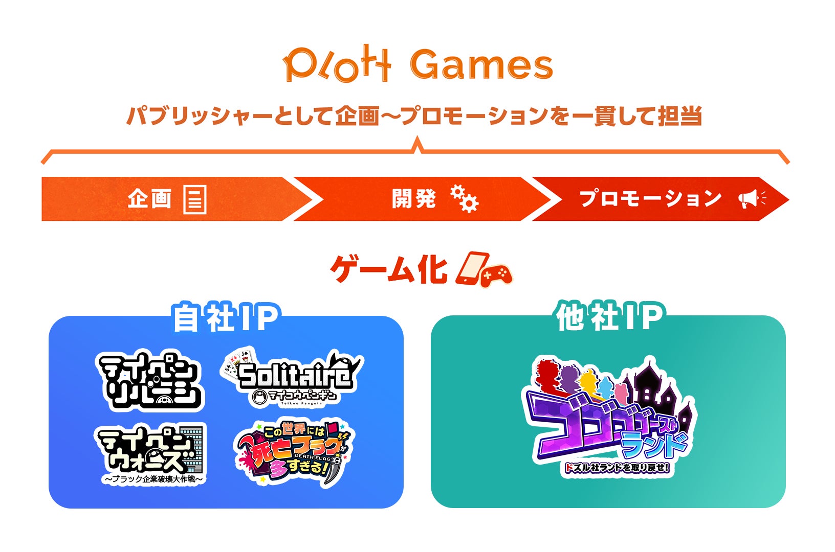 また、Plott Gamesでは企画、開発、プロモーションを一貫して担当するパブリッシャーとして、IPホルダー様のゲーム化ニーズに応える体制を強化しています。今後も自社で培ったノウハウと実績をもとに、IPの価値を最大化するゲーム開発を提供してまいります。