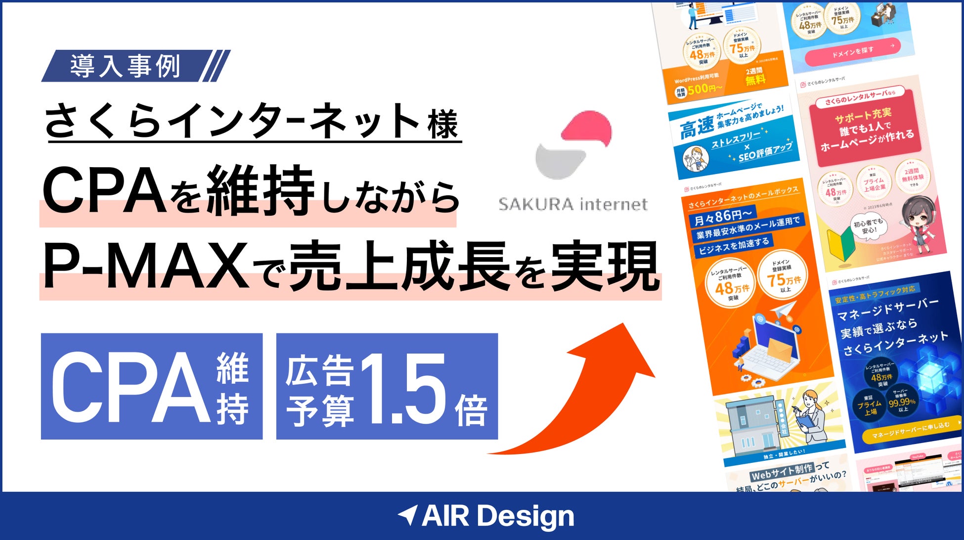 さくらインターネットがガラパゴスの「AIR Design」を導入し、P-MAXのクリエイティブ制作を強化した事例を公開。CPAを維持したまま広告予算を1.5倍に拡大し、事業の売上成長に大きく貢献。